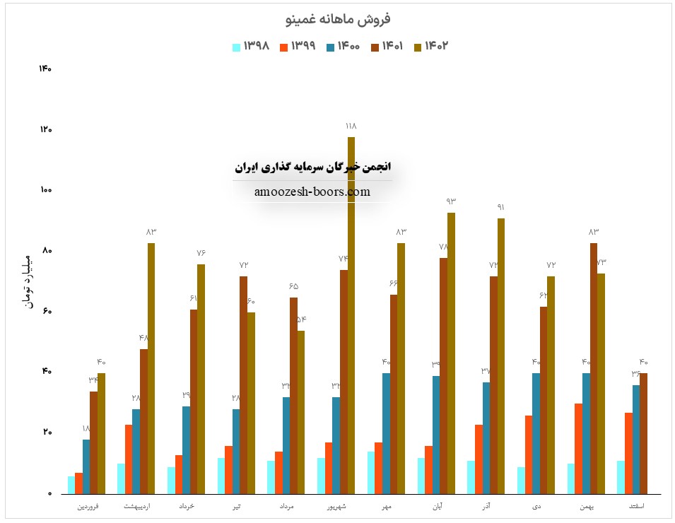 فروش آذر ماه سال 1402 سهم غمینو 90.8 میلیارد تومان گزارش شده است که 71% از این رقم از طریق فروش داخلی و مابقی از طریق صادرات تامین گردیده است، تغییرات درآمدی غمینو به شرح زیر میباشد: