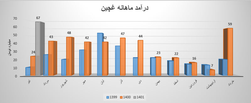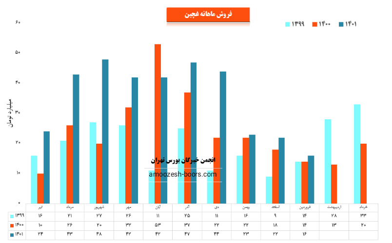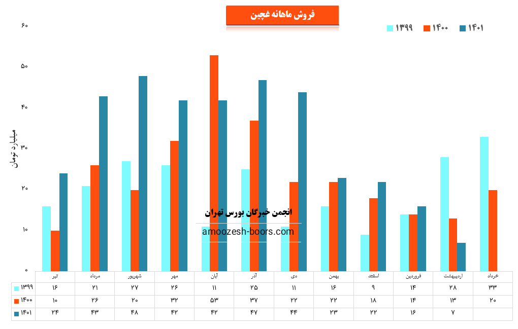 شرکت کشت و صنعت چین چین با نماد غچین توانسته در فروردین ماه سال ۱۴۰۱ حدود مبلغ ۱۶ میلیارد تومان فروش داشته باشد که این میزان در مقایسه با ماه گذشته و همچنین در مقایسه با مدت مشابه سال گذشته به ترتیب ۲۷ % کاهش و ۱۴ % رشد درآمد را تجربه کند.