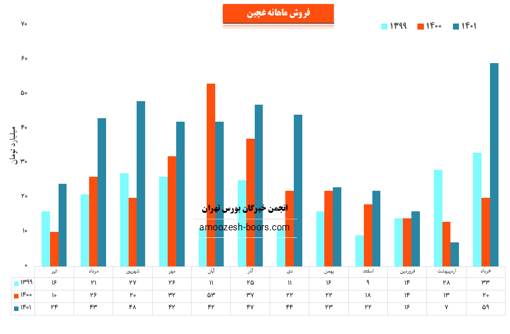 نماد غچین در اردیبهشت ماه حدود بیش از 199 تن از محصولات خود را به فروش رسانده که این میزان در مقایسه با حجم فروش ماه گذشته خود حدود 58% کاهش پیدا کرده است.