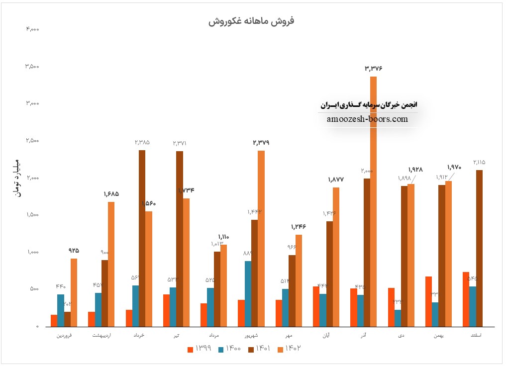 فروش آذر ماه سال 1402 سهم غکورش 3376.4 میلیارد تومان گزارش شده است، تغییرات درآمدی غکورش به شرح زیر میباشد: