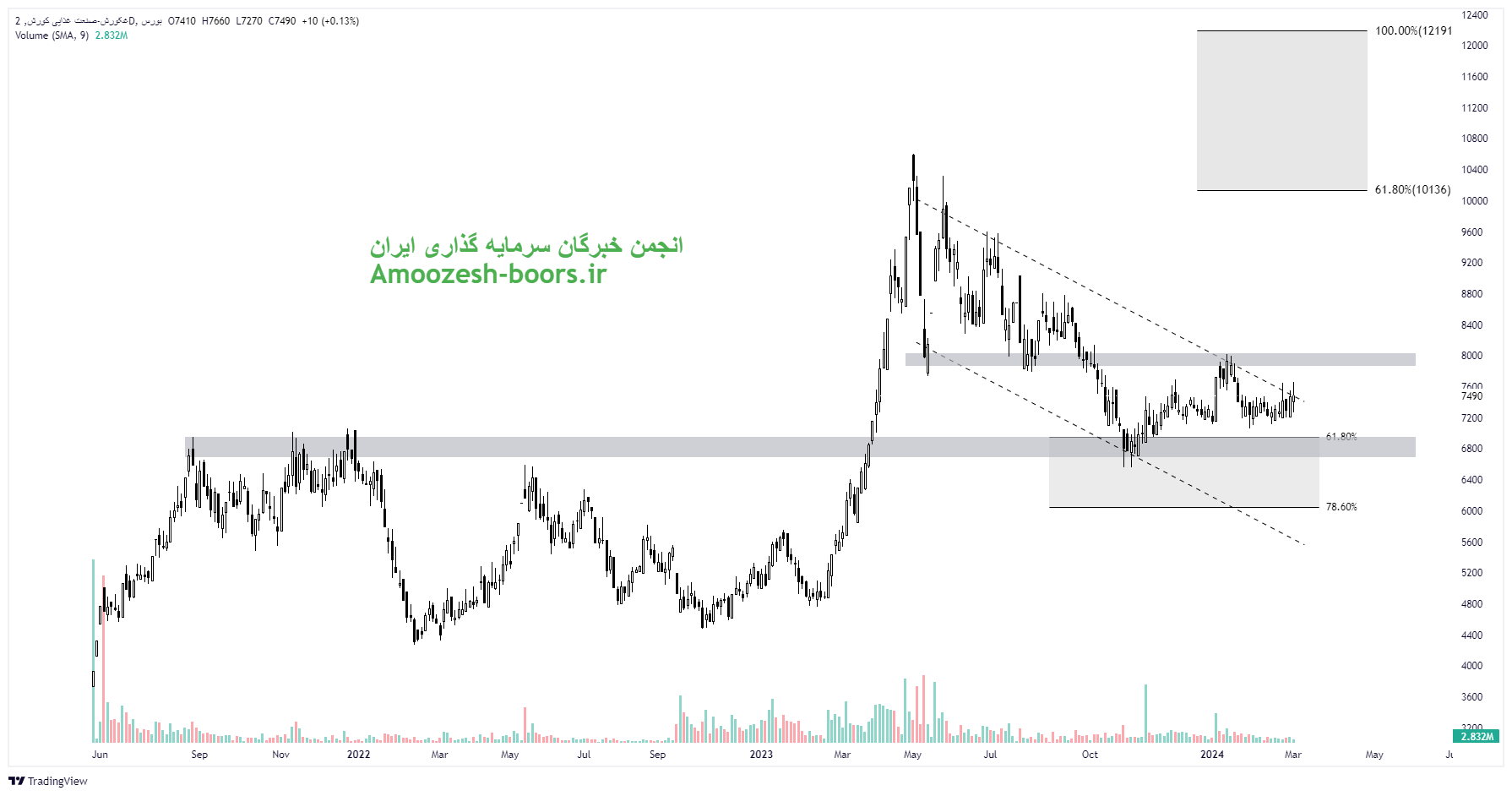 قیمت سهم غکورش بر روی مقاومت مهم ناحیه سقف کانال نزولی قرار گرفته است لذا در صورت ایجاد تقاضا در کلیت بازار و همچنین عبور از مقاومت ناحیه ۷۹۰ تومان، انتظار تداوم حرکت صعودی سهم غکورش تا نواحی مقاومتی ۱۰۰۰ و ۱۲۰۰ تومان در میان مدت میرود. همچنین در صورت بروز واکنش منفی نسبت به ناحیه مقاومتی سقف کانال نزولی ترین حمایتهای سهم غکورش نواحی ۶۸۰ و ۶۰۰ تومان در نظر گرفته خواهند شد.