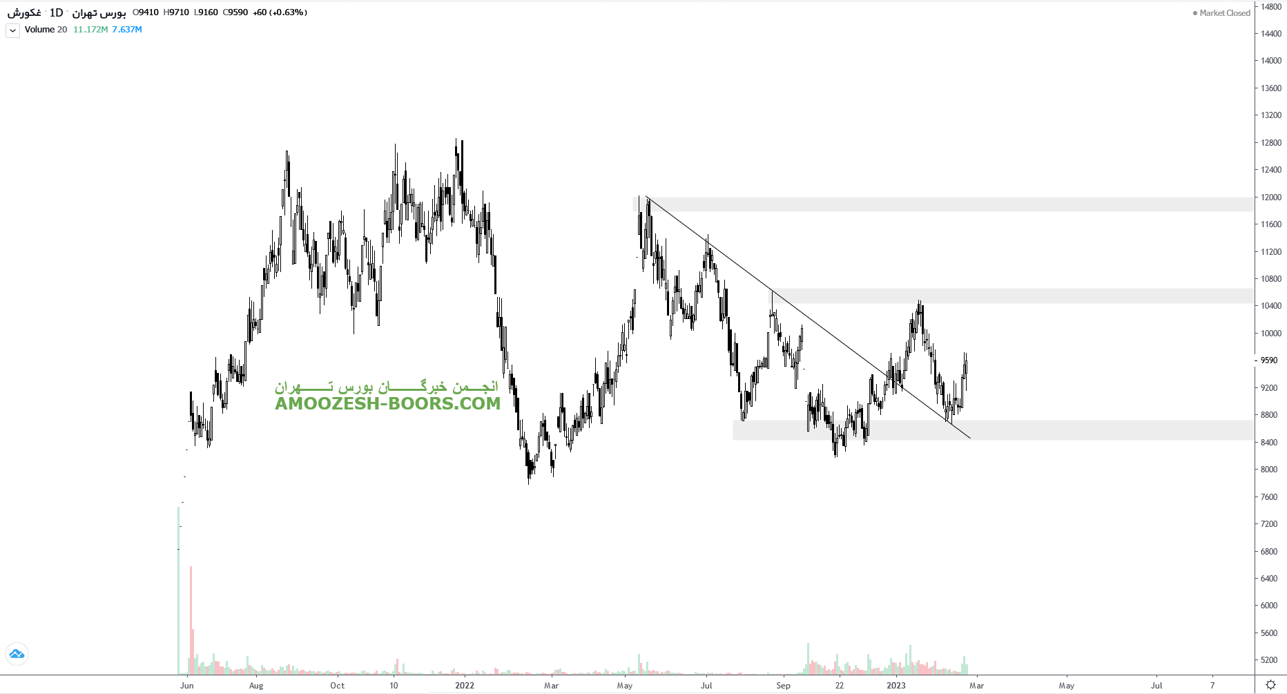 قیمت سهام غکوروش در حال حرکت به سمت مقاومت ناحیه ۱۰۵۰ تومان میباشد. لذا در صورت شکست این ناحیه، مقاومت بعدی سهم غکوروش ناحیه ۱۲۰۰ تومان در نظر گرفته شده است. همچنین در صورت تمایل قیمت به اصلاح بیشتر اولین حمایت سهم غکوروش ناحیه ۸۵۰ تومان تعیین شده است.