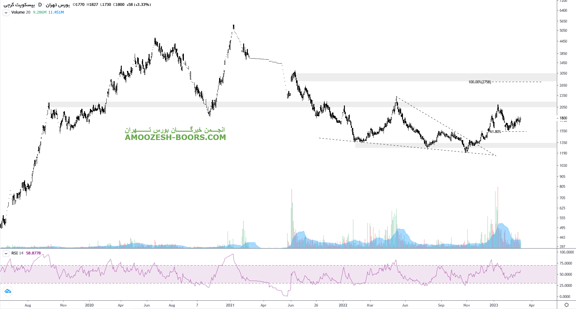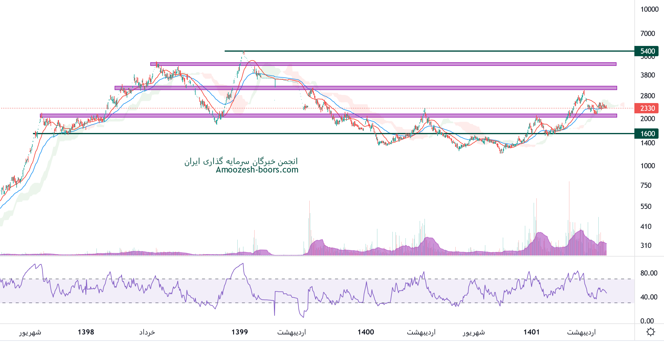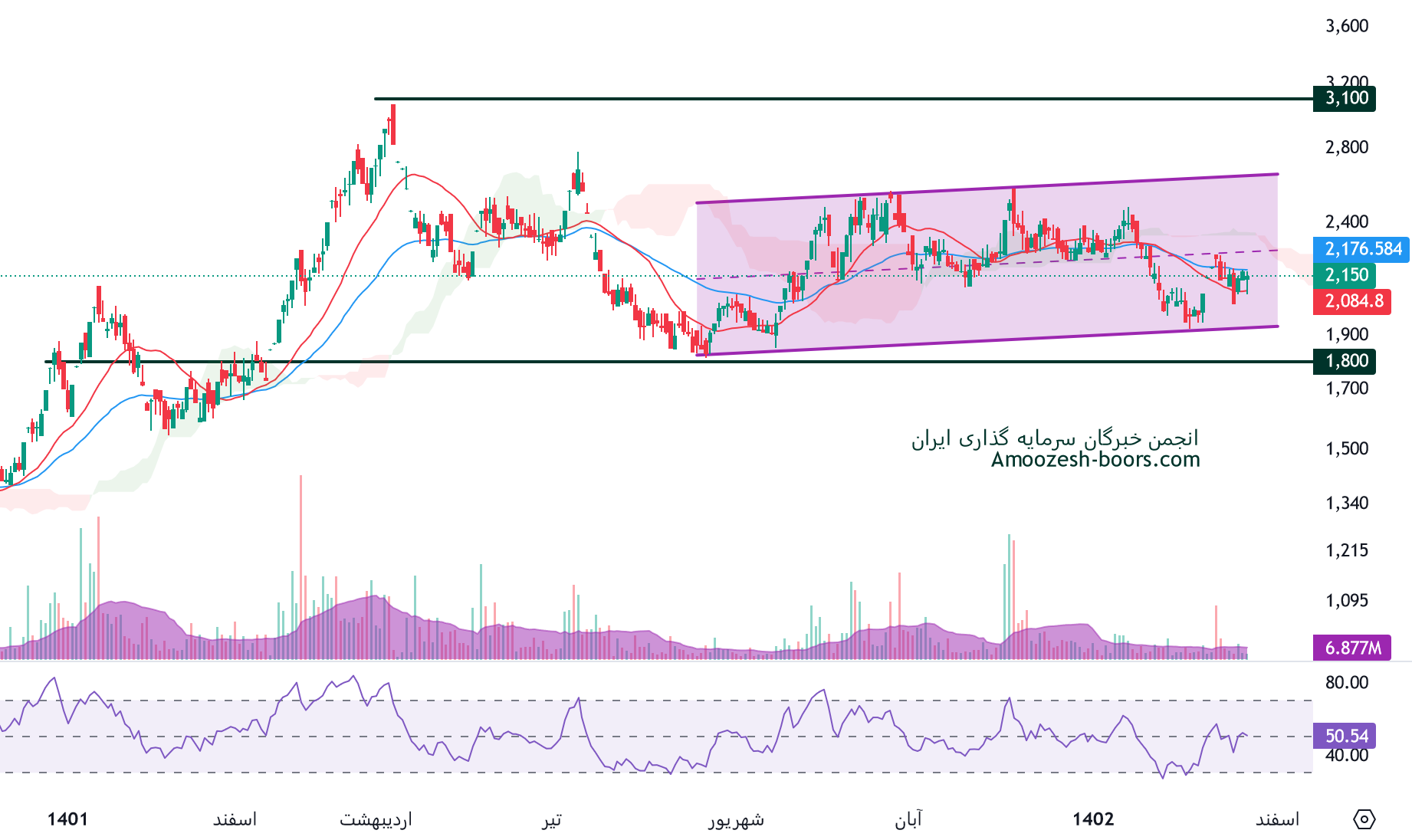 همانطور که در تحلیل تکنیکال غگرجی میبینیم قیمت در محدوده حمایتی 1950 ریال و محدوده مقاومتی 2300 ریال در حال نوسان میباشد.