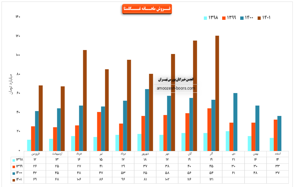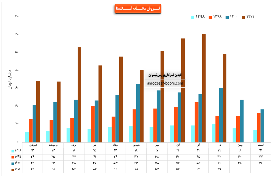 نماد غگلستا در آذر ماه حدود بیش از 2700 تن از محصولات خود را به فروش رسانده که این میزان در مقایسه با حجم فروش ماه گذشته خود حدود 2% کاهش پیدا کرده است.