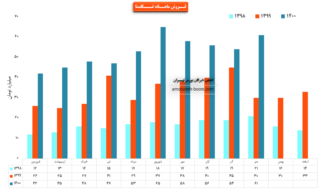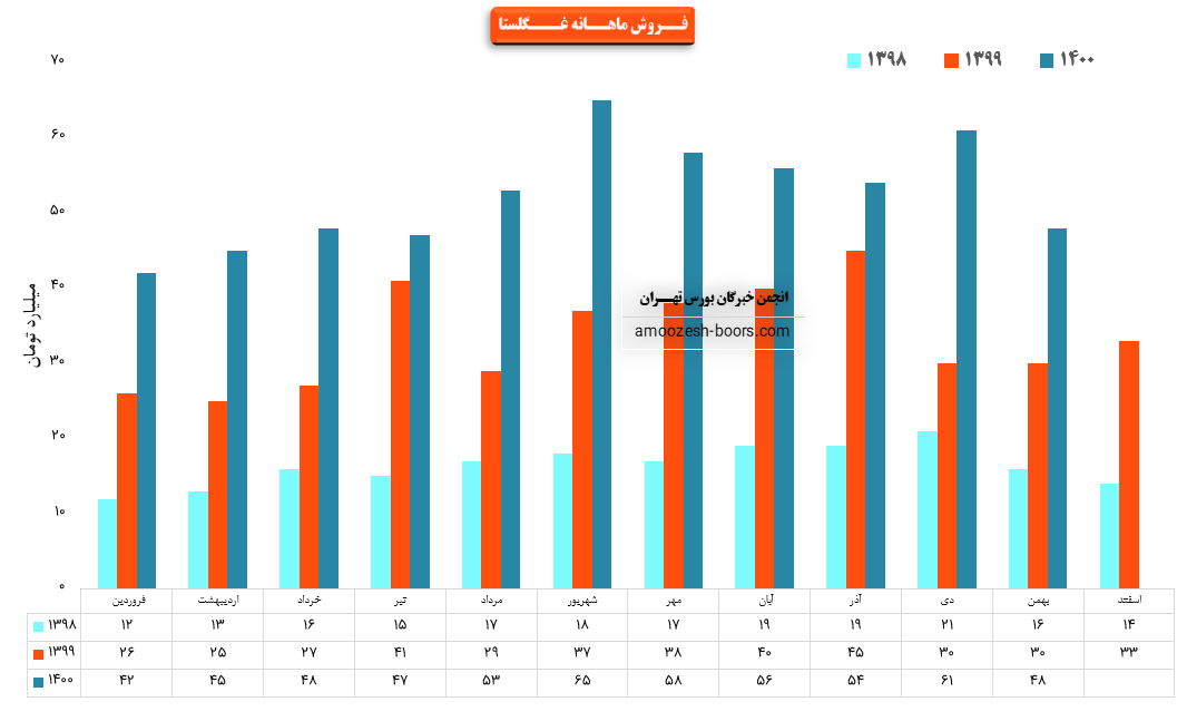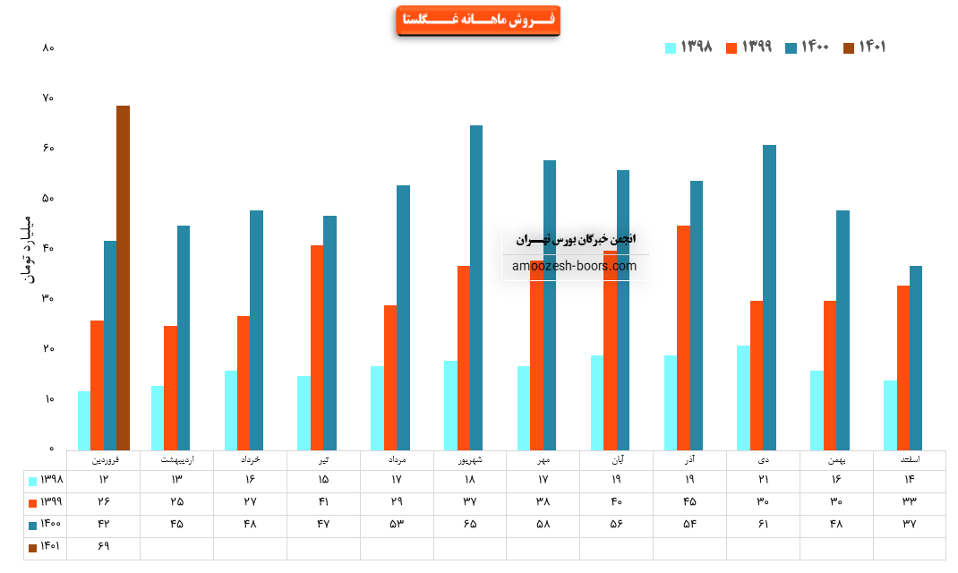 نماد غگلستا در بهمن ماه حدود بیش از 1900 تن از محصولات خود را به فروش رسانده که این میزان در مقایسه با حجم فروش ماه گذشته خود حدود 21% کاهش پیدا کرده است.