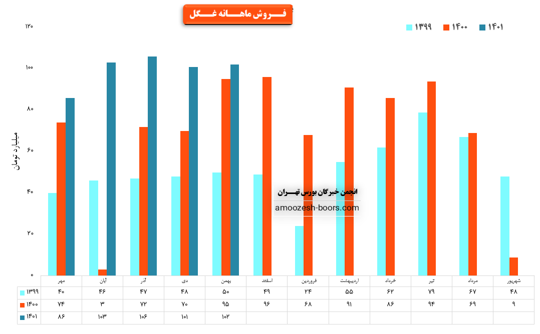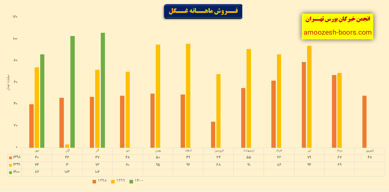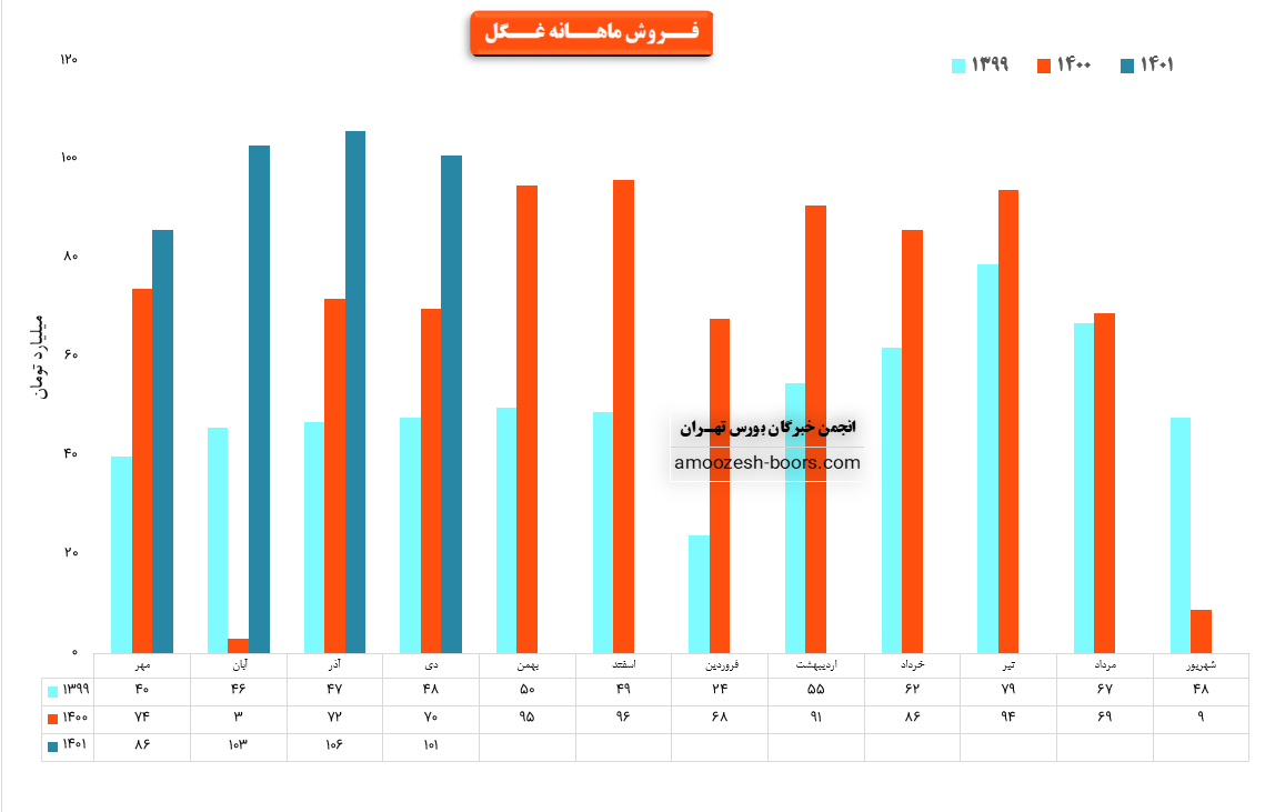 نماد غگل در دی ماه ۱۴۰۰ مبلغ ۱۰۱ میلیارد تومان درآمد داشته است که این میزان در مقایسه با ماه گذشته ۵ % افت و همچنین در مقایسه با مدت مشابه سال گذشته ۴۴ % رشد درآمد پیدا کرده است. شرکت در دی ماه حدود ۹۳۰۰ تن از محصولات خود را به فروش رساند که در مقایسه با ماه گذشته با این ۱۷ % افت میزان فروش روبرو شده است.