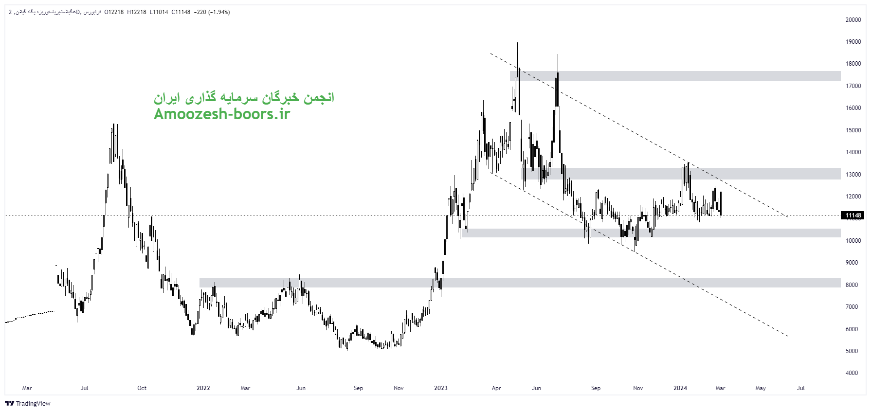 قیمت سهم غگیلا با برخورد به ناحیه مقاومتی سقف کانال نزولی میان مدت خود به مسیر اصلاحی خود بازگشته و لذا در همین مسیر حمایتهای مهم ناحیه ۱۰۰۰۰ ریال و ۸۰۰۰ ریال را پیش روی خود میبیند. همچنین در صورت ایجاد تقاضا در کلیت بازار و برگشت سهم غگیلا مقاومتهای مهم نواحی ۱۳۰۰۰ ریال و ۱۷۵۰۰ ریال مهمترین مقاومتهای سهم غگیلا محسوب میشود.