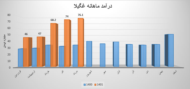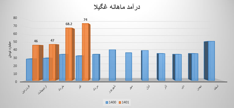 نماد غگیلا در تیر ماه معادل 740,027 میلیون ریال از محصولات خود را به فروش رسانده است که نسبت به دوره 1 ماهه مشابه سال قبل 131% افزایش داشته است.همچنین درآمد نماد غگیلا نسبت به ماه قبل 9درصد و نسبت به میانگین ماهانه 38درصد افزایش داشته است .