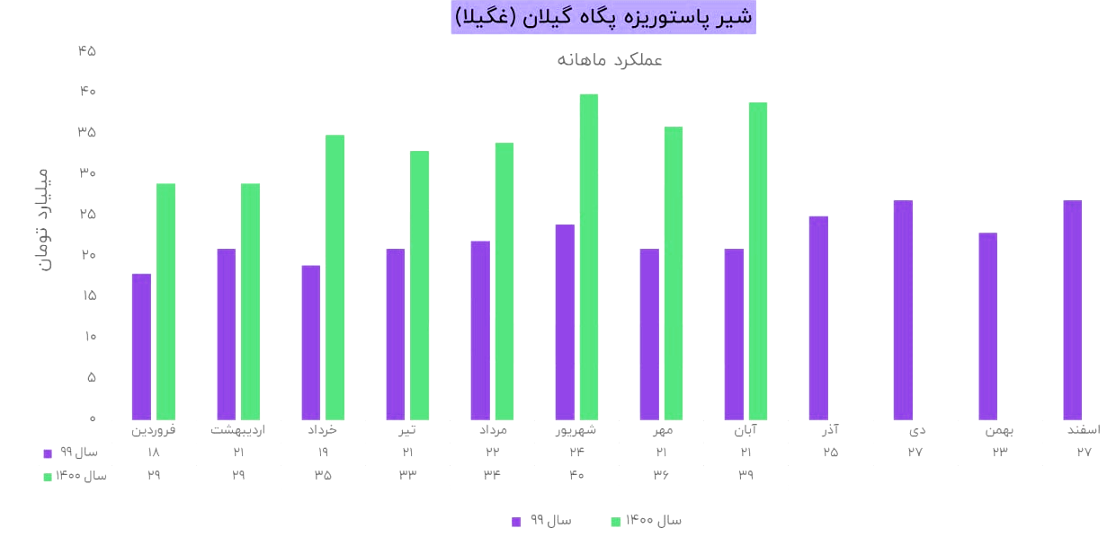 شرکت شیر پاستوریزه پگاه گیلان با نماد غگیلا طی عملکرد 1 ماهه منتهی به 1400/08/30 معادل 386,657 میلیون ریال از محصولات خود را به فروش رسانده که نسبت به دوره 1 ماهه مشابه سال قبل 81% افزایش داشته است.