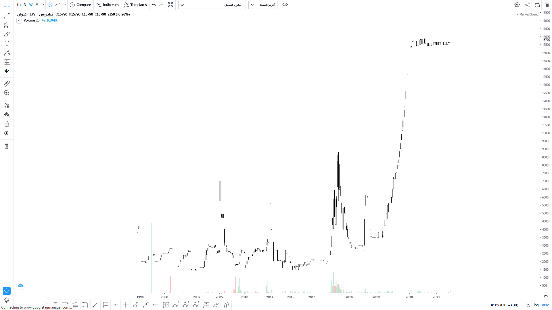 با توجه به ابهام در انتشار اطلاعات مالی سهم غیوان و همچنین شناوری پایین نماد غیوان مشاهده میفرمایید نمودار قیمت سهام شرکت کیوان را در تایم هفتگی که در مدار صعود قرار دارد اما با توجه به چارت این نماد نمی توان به صورت جزئی آن را تحلیل کرد و خطای در تحلیل را ایجاد مینماید و دیتا برای بالا بردن احتمالات سیگنال غیوان کافی نیست