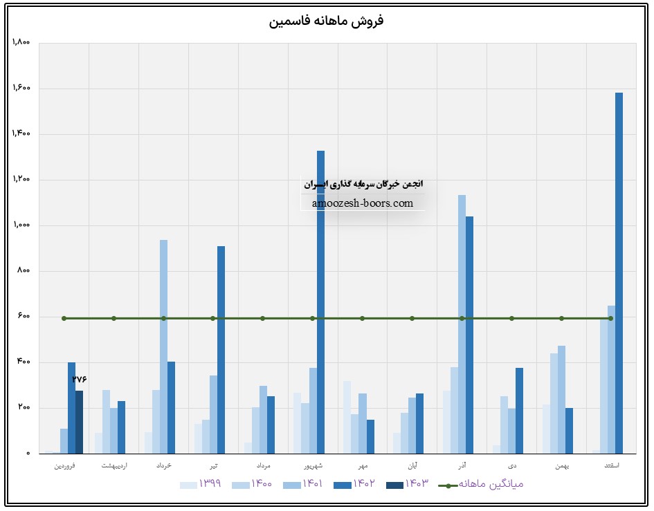 فاسمین در فروردین ماه توانست بالغ بر 2375 تن از محصولات خود را به فروش برساند که این میزان در مقایسه با فروش ماه گذشته حدود 93% کاهش پیدا کرده است.