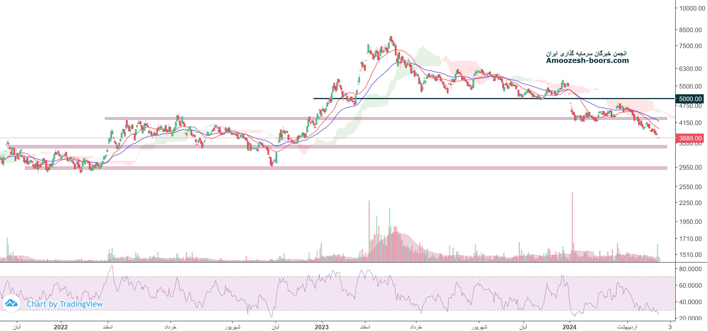 با بررسی نمودار تکنیکال نماد فاسمین، قیمت همچنان در روند نزولی قرار دارد و در حال ادامه دادن به اصلاح میباشد، اولین حمایت پیش روی سهم فاسمین 3400 ریال خواهد بود، در صورتی که افزایش تقاضا را داشته باشیم، اولین مقاومت نماد فاسمین 4400 ریال میباشد.