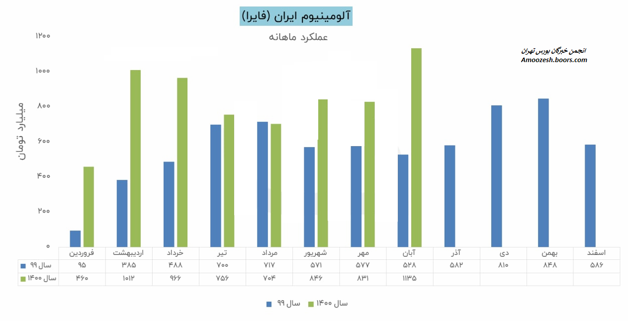 شرکت آلومینیوم ایران طی عملکرد 1 ماهه منتهی به 1400/10/30 معادل 9,143,825 میلیون ریال از محصولات خود را به فروش رسانده که نسبت به دوره 1 ماهه مشابه سال قبل 13% افزایش داشته است.شرکت آلومینیوم ایران در دی ماه ۸ میلیون و ۶۸۸ هزار و ۷۲۲ میلیون ریال به صورت داخلی فروخته است عمده مبلغ فروش برای شمش خالص می باشد که نسبت به ماه قبل رشد ۷ درصدی داشته است اما مبلغ فروش صادراتی این شرکت برابر با ۴۵۵ هزار و ۱۰۳ میلیون ریال بوده که کاهش چشمگیر ۸۳ درصدی نسبت به آذرماه را تجربه نموده است به ن است ظر میرسد شرکت در سال مالی جاری در بخش داخلی تمرکز بیشتر خود را بر روی فروش شمش خالص گذاشته است که با توجه به حاشیه سود پایین ترین محصول نسبت به شمش آلیاژ این اقدام مثبت ارزیابی نمیشود تغییرات نرخ محصولات این شرکت نسبت آذرماه نیز به این صورت می باشد شمش بیلت ۱۲ درصد شمش خالص ۵ درصد شمش بیلت صادراتی ۲۲ درصد شمش خالص صادراتی -۸ % دلاری و نرخ جهانی آلومینیوم در دی ماه رشد ۱۰ درصدی داشته است