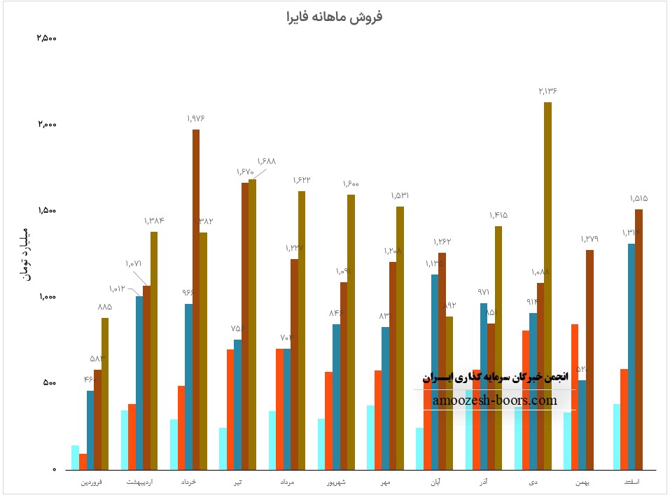 فایرا در اسفند ماه از طریق فروش داخلی به فروش 2271.6 میلیارد تومانی دست یافت که 65% از این فروش داخلی و 35% را صادرات تشکیل داده است، افزایش مقداری فروش نسبت به ماه قبل ناشی از رشد مقدار فروش صادراتی در اسفند ماه میباشد.