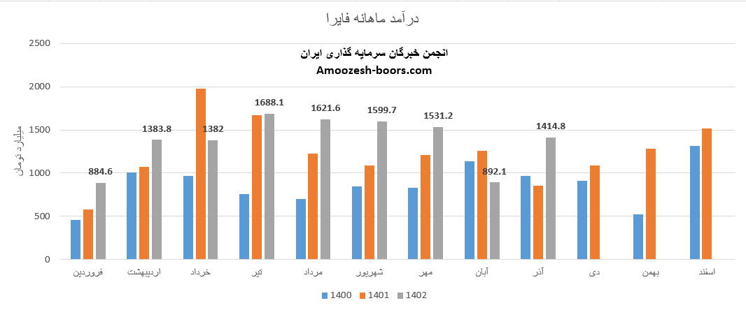 فروش آذر ماه سال 1402 سهم فایرا 1414.8 میلیارد تومان گزارش شده است که 90% از این رقم از طریق فروش داخلی و مابقی از طریق صادرات تامین گردیده است، تغییرات درآمدی فایرا به شرح زیر میباشد:
