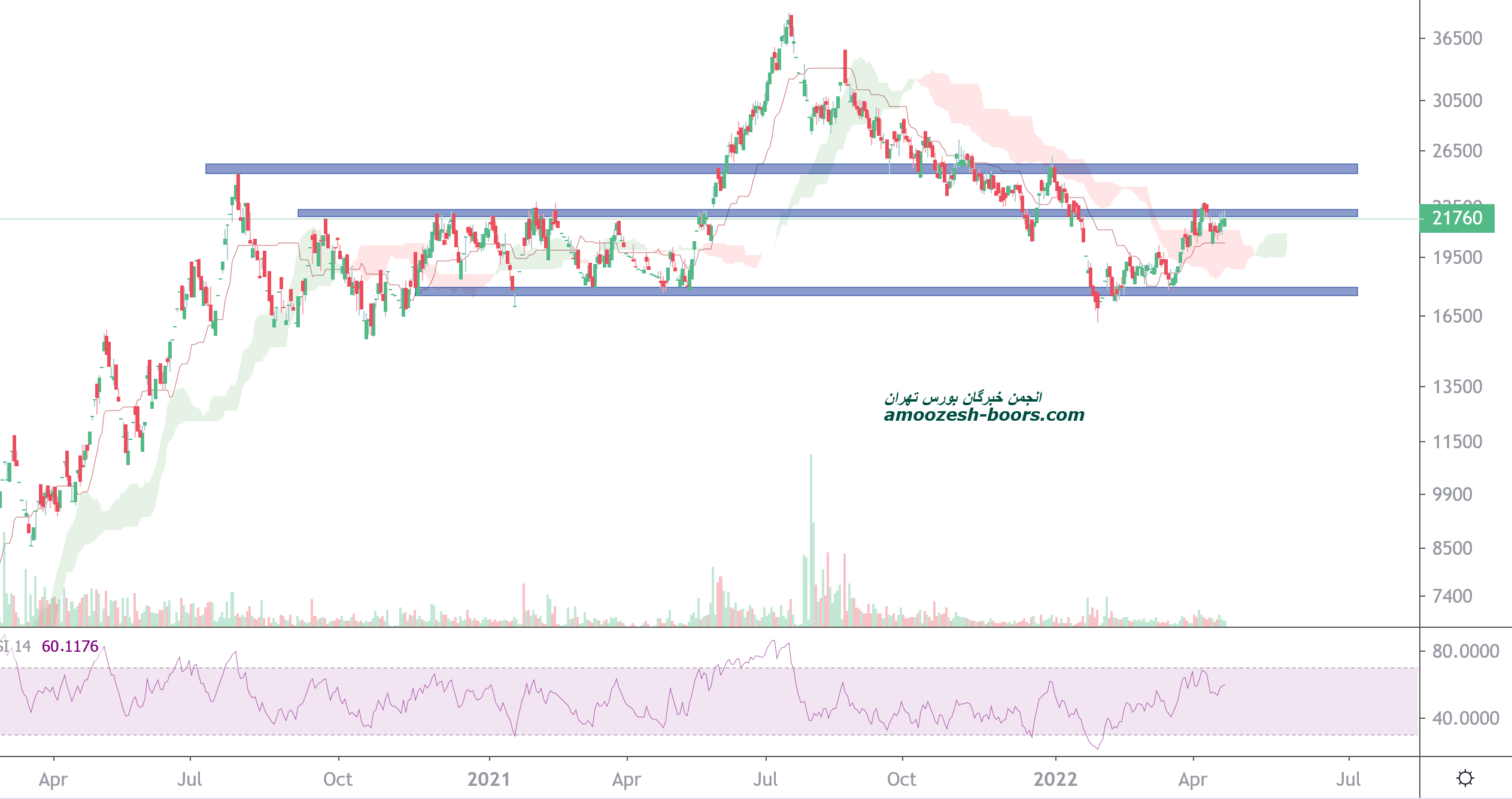 قیمت در حال حاضر درگیر محدوده مقاومتی استاتیک 22000 ریال میباشد و در صورت تقویت تقاضا و عبور از این محدوده مقاومتی حرکت قیمت تا محدوده قیمتی 25000 ریال دور از ذهن نخواهد بود و در صورتی که قیمت وارد فاز اصلاحی شود کف حمایتی سهم 18000 ریال در نظر گرفته خواهد شد و حد ضرر دوستان کوتاه مدتی فعال خواهد شد.