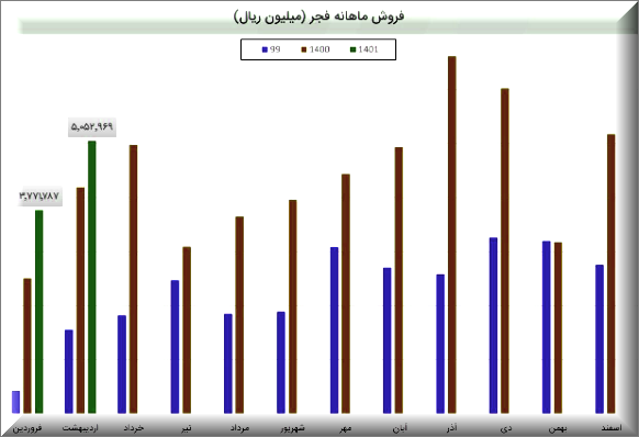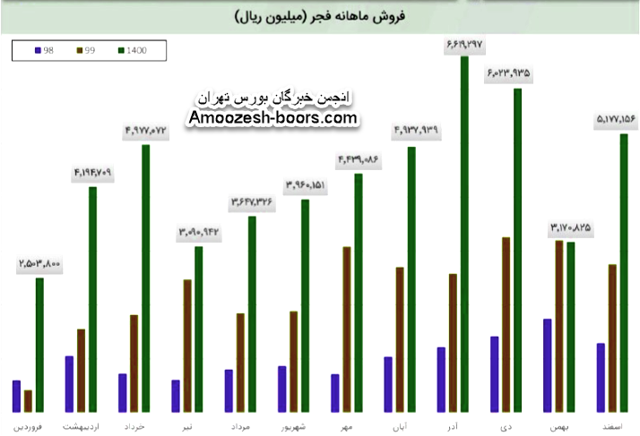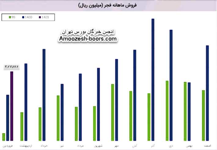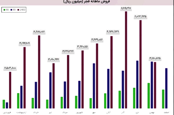 (92%) درصد از در آمد شرکت درین ماه مربوط به فروش داخلی و (8%) درصد آن مربوط به کل صادرات شرکت است. درآمد شرکت در این دوره نسبت به ماه قبل 63% افزایش و نسبت به میانگین ماه های قبل 20% افزایش داشته است. شرکت نسبت به دوره 1 مشابه سال قبل 88% افزایش درآمد داشته است.مقدار فروش در این مدت 28 درصد افزایش داشته و به 204 هزار تن رسیده اما فروش ورق گالوانیزه 6 درصد افت کرده است. فجر در اسفند 11 هزار تن ورق گالوانیزه تولید کرده و 16 هزار تن فروخت که 15 درصد کاهش تولید ولی 110 درصد افزایش فروش را نشان میدهد.