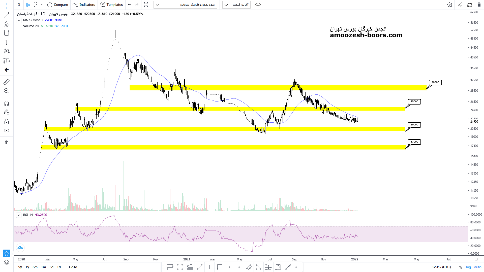 با توجه به قرارگیری قیمت بر روی محدوده حمایتی 2000 تومان در صورت حمایت و شکست مقاومت مووینگ اوریج، موج صعودی قیمت میتواند تا محدوده 2500 و 3000 درصورت شکست به ترتیب صعودی داشته باشد اما درصورت عدم حمایت و شکست محدوده حمایتی 2000 ریزش بیشتر تا محدوده 1700 نیز ادامه خواهد داشت