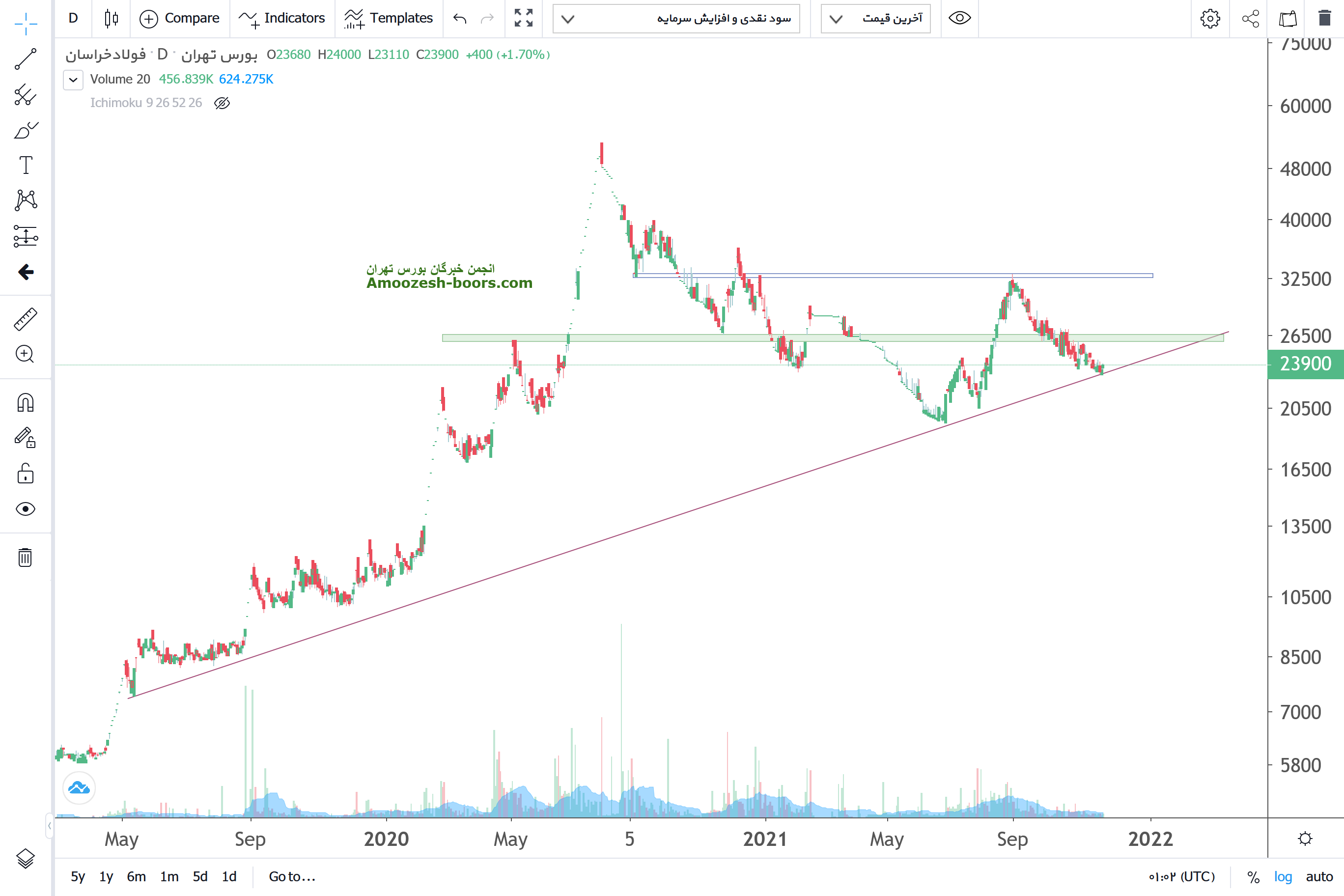 قیمت با مومنتوم ضعیف در محدود حمایتی خط روند بلند مدت ومنطقه ای که بلحاظ تاریخی و پرایس اکشن برخورد داشته و قله و دره قیمتی ایجاد نموده است، میباشد درصورتیکه این حمایت ناشی از فشار فروش از بین رود حد ضرر فعال خواهد شد و در صورت تثبیت قیمت نیز مقاومت 26000 و 32000 را سر خود دارد .