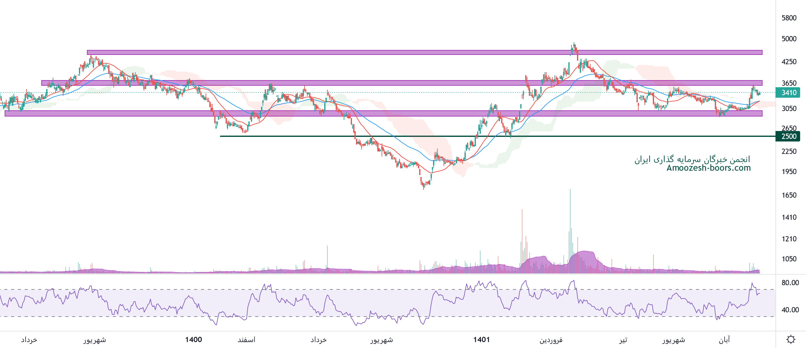 در بررسی نمودار تکنیکال فخوز، قیمت سهم در حال نوسان مابین محدوده حمایتی 3000 و محدوده مقاومتی 3600 ریال میباشد، در صورت شدت گرفتن فشار تقاضا و عبور قیمت از محدوده مقاومتی ذکر شده، حرکت سهم تا محدوده 4500 ریال دور از ذهن نخواهد بود، همچنین در صورت از دست رفتن محدوده حمایتی 3000 ریال، اصلاح قیمت نماد فخوز تا سطح حمایتی 2500 ریال ادامه خواهد داشت.