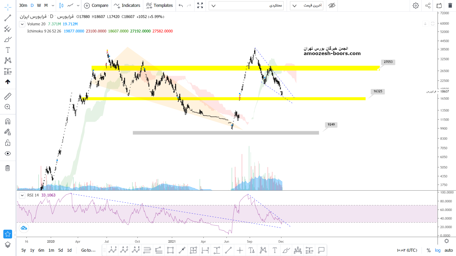 سهم فرابورس بعد از یک رشد و اصلاح سه موجی، در حال تکمیل الگوی اصلاحی خود میباشد که انتظار میرود در محدوده 1600 تومان واکنشی مثبت به این سطح حمایتی از خود نشان دهد و تا محدوده 2100 تومان رشد کند. در صورت بیس سازی قیمت درین ناحیه سیگنال ورود پله ای صادر میگردد اما درصورت عدم حمایت نیز انتظار کااهش بیشترقیمت تا محدوده 1350 را داریم . باید منتظر واکنش قیمت ماند.