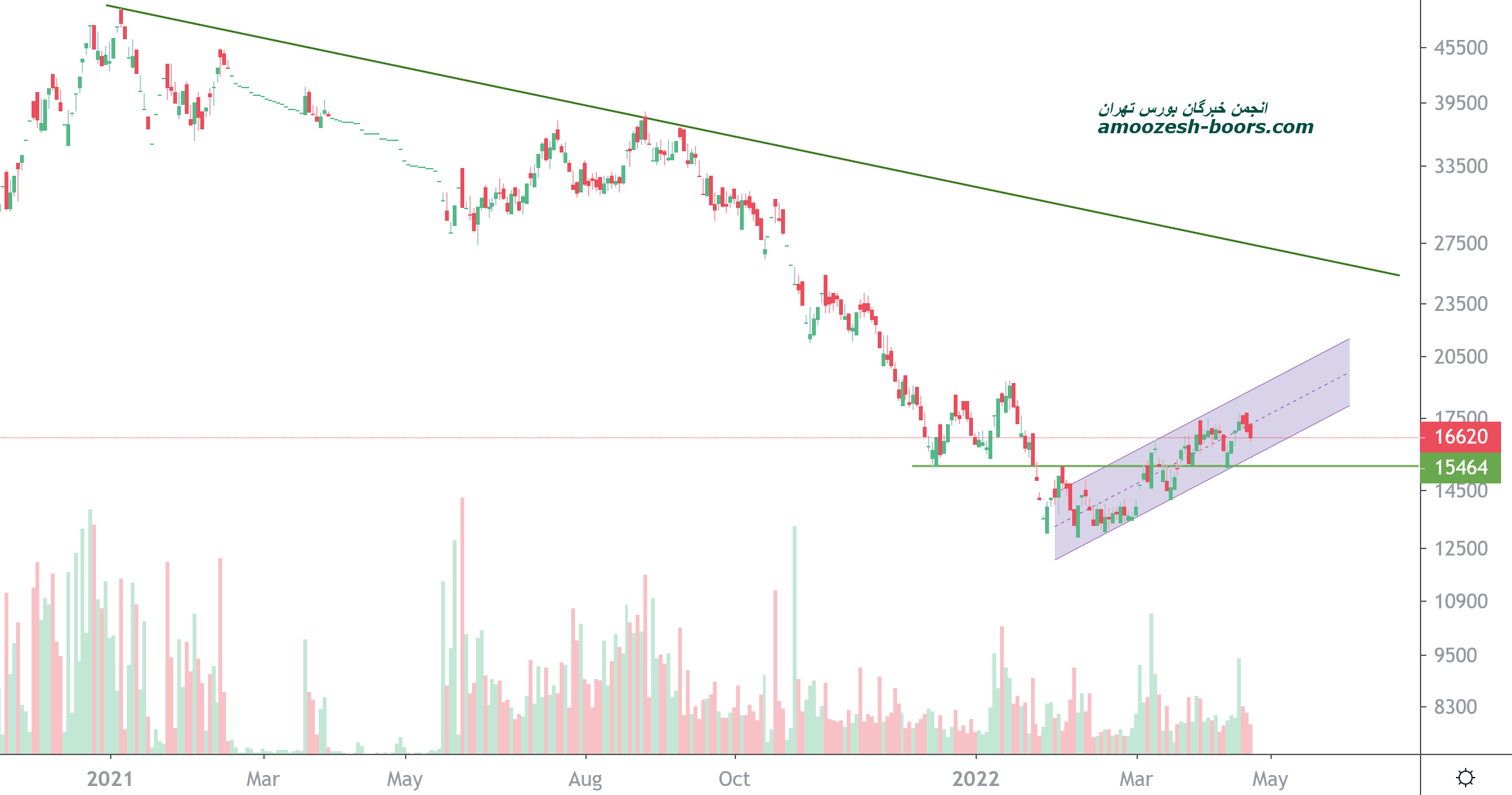 قیمت در حال حاضر در کانال صعودی کوتاه مدتی در حال پیشروی میباشد و در صورت ادامه دار شدن فشار عرضه و شکسته شدن کف کانال و تثبیت زیر آن حمایت بعدی سهم 15500 ریال در نظر گرفته خواهد شد و در صورت سناریوی صعودی مقاومت های سهم میدلاین و سقف کانال صعودی خواهند بود.
