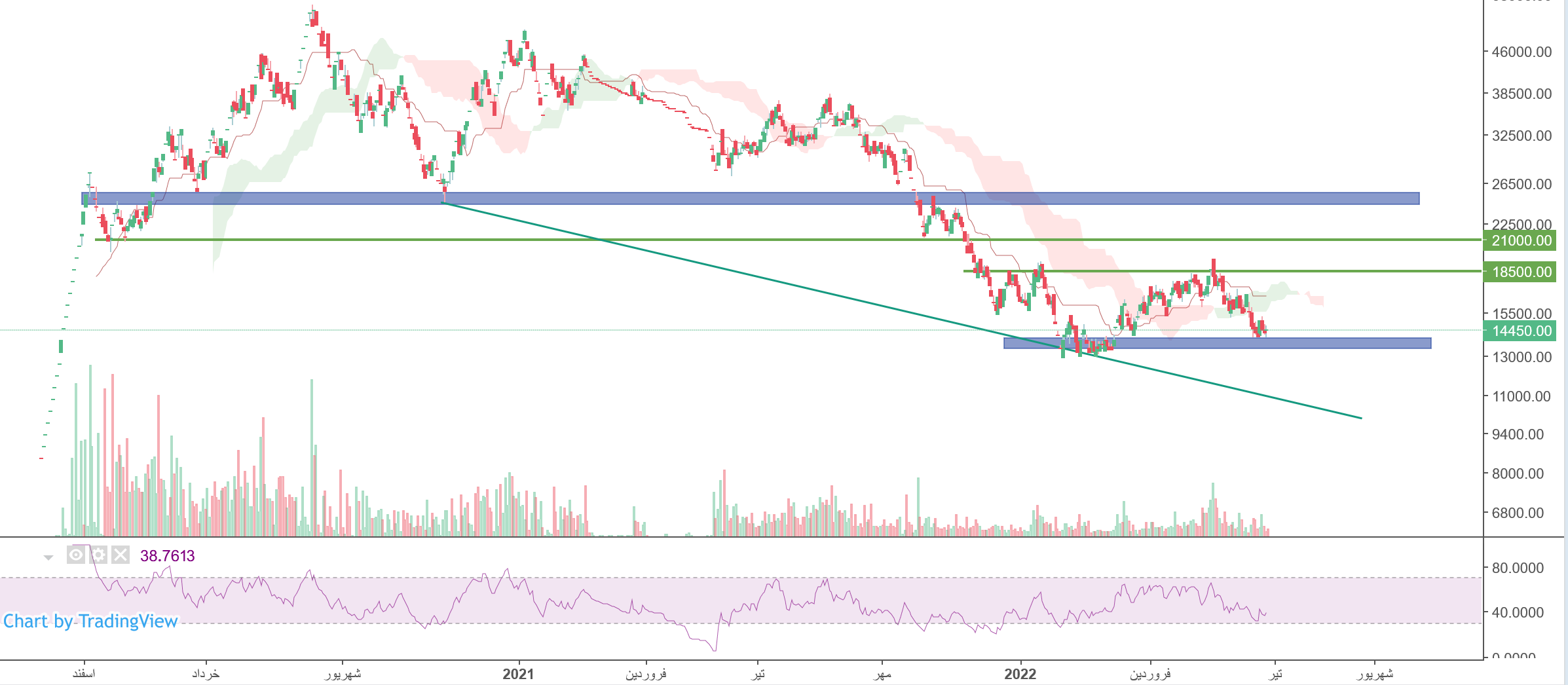 قیمت روی محدوده حمایتی 13500 ریال قرار دارد،در صورت تثبیت قیمت تارگت سهم 18500 ریال خواهد بود،همچنین در صورت از دست رفتن حمایت،حمایت بعدی 10500 ریال در نظر گرفته خواهد شد که در این صورت حد ضرر سهم فعال میگردد.