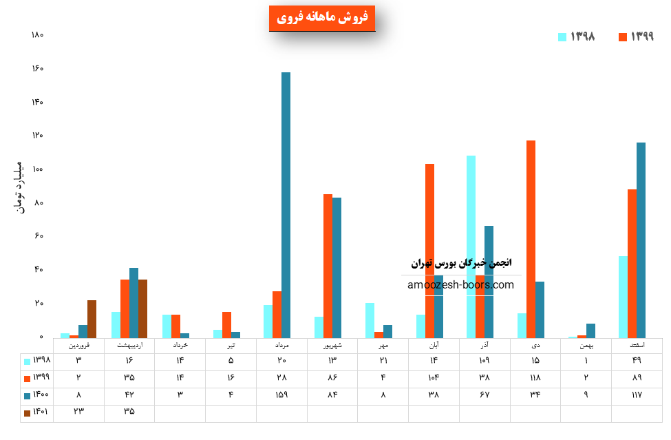 این شرکت در فروردین ماه حدود ۸۷ تن فروش داخلی و همچنین حدود ۵۰۰ تن فروش صادراتی داشته است که سهم فروش صادراتی از فروش کل در این ماه حدود ۸۷ % بوده است.