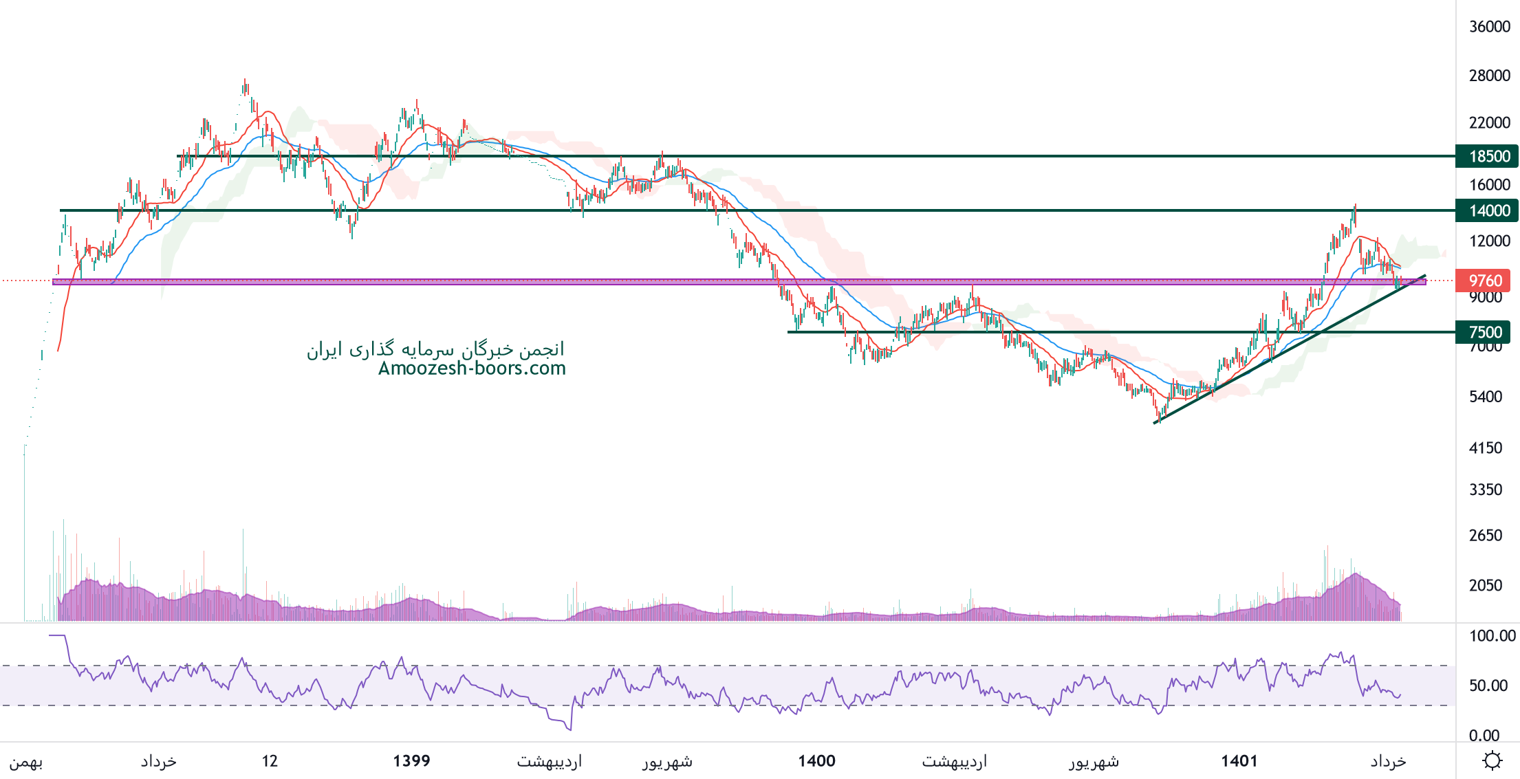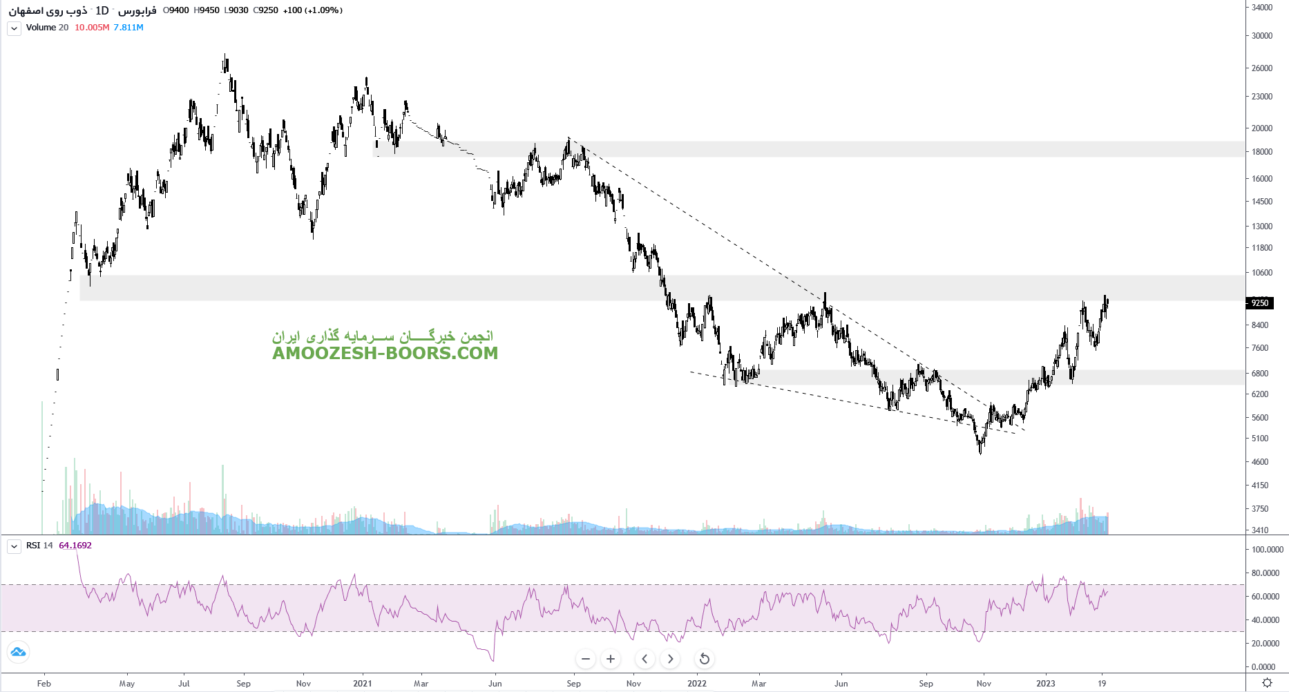 با توجه به نمودار تکنیکال نماد فروی پس از رسیدن به تارگت میان مدت خود با توجه به شرایط بازار بورس وارد فاز اصلاحی شده و اکنون در منطقه حمایت PRZ از تلاقی منطقه پر تراکم و خط روند کوتاه مدت قرار دارد، تثبیت قیمت در این ناحیه محتمل بوده و در صورت ایجاد کندل برگشتی مقاومت سهم فروی 14000 ریال در نظر گرفته خواهد شد و در سناریوی بد بینانه در صورت ادامه دار بودن هیجانات منفی بازار و از دست رفتن این سطح حمایتی فشار فروش افزایش یافته و حمایت بعدی فروی محدوده 7500 ریال در نظر گرفته خواهد شد.