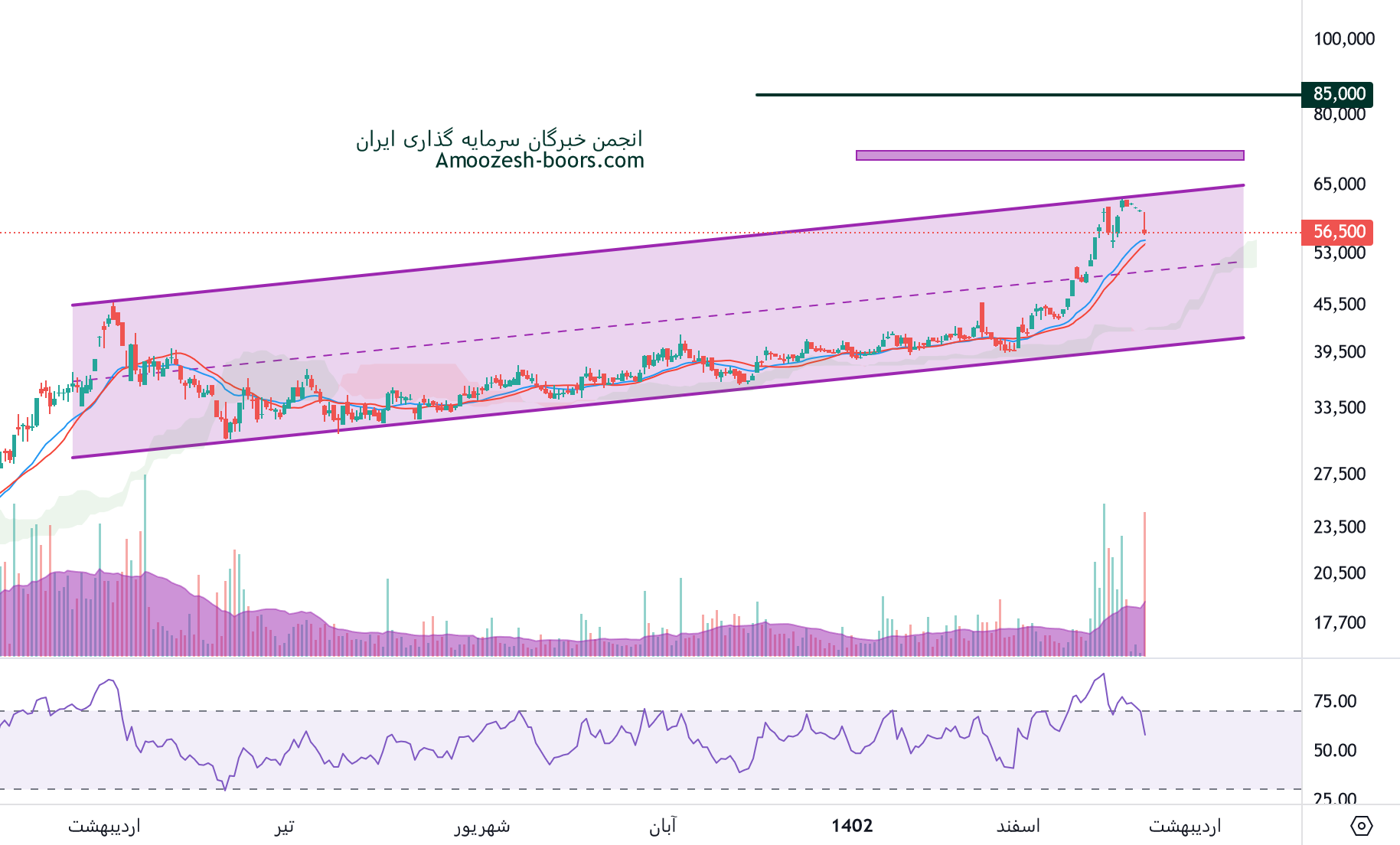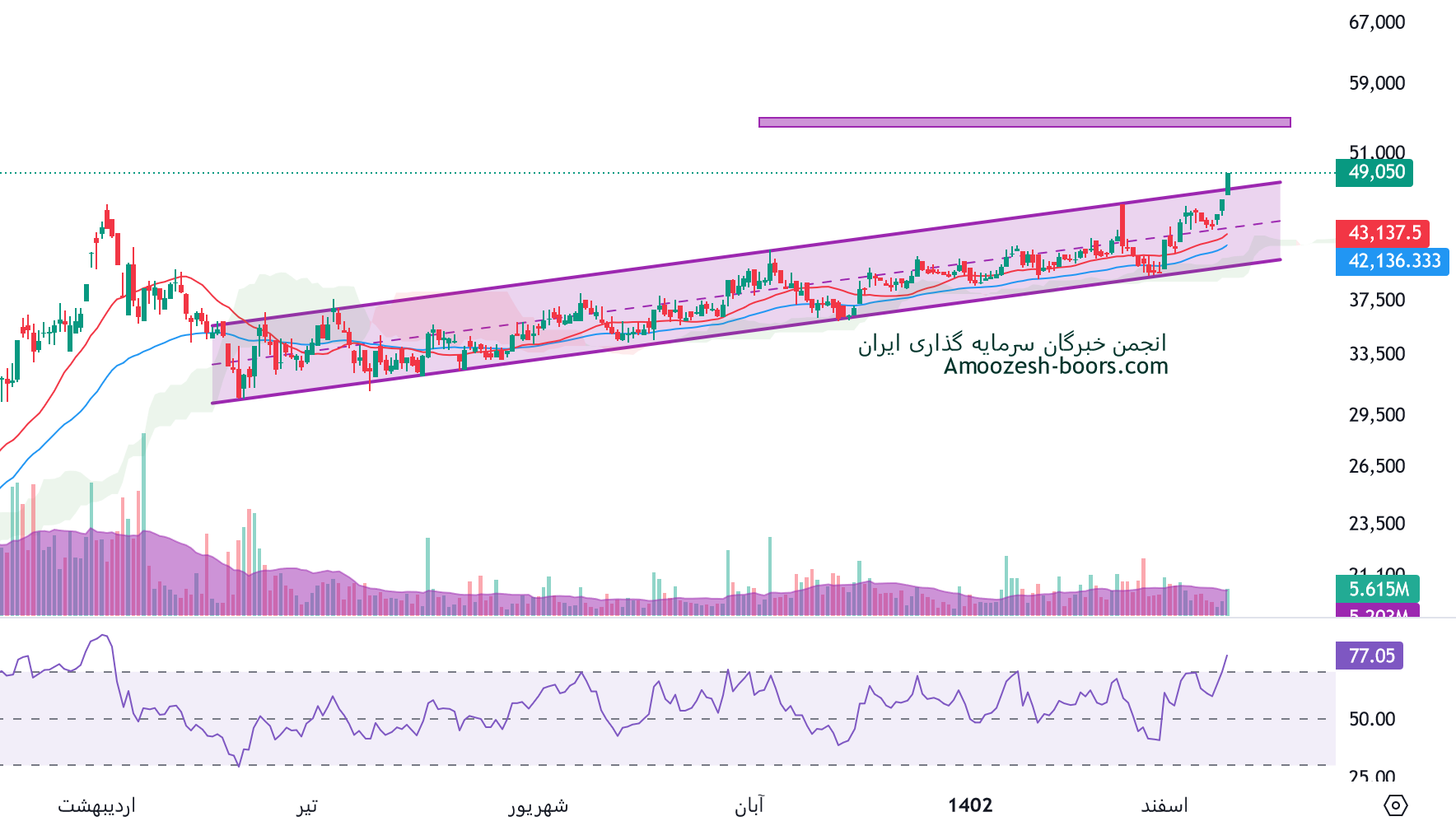 قیمت فزر به صعود های متوالی در چند روز معاملاتی اخیر توانسته به سقف کانال صعودی خود نفوذ کند، در صورتی که این شکست تثبیت شود، تارگت فزر 55000 ریال در نطر گرفته خواهد شد، همچنین در صورت فشار فروش در این محدوده و ورود قیمت به فاز اصلاحی، اولین حمایت سهم فزر 45000 ریال خواهد بود.