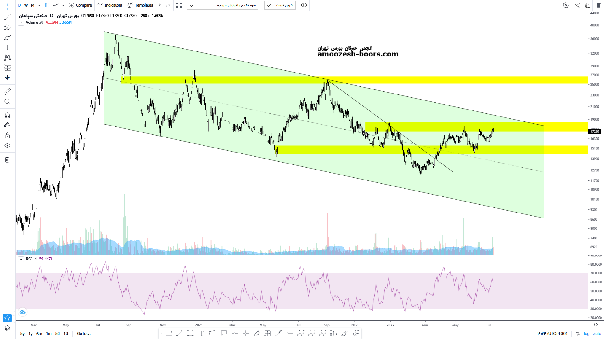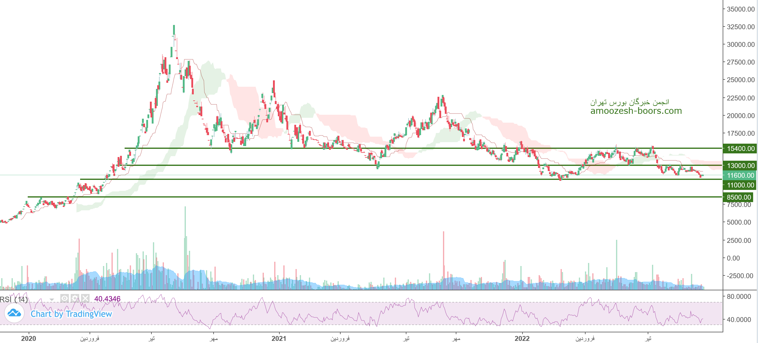 قیمت پس از اصلاح تا ناحیه حمایتی ۱۴۵۰ تومان برای سومین بار در حال تست ناحیه مقاومتی ۱۸۰۰ تومان می باشد. در صورت شکست این ناحیه مقاومتی قیمت می تواند با شکست سقف کانال نزولی خود تا ناحیه مقاومت ۲۶۰۰ تومان نیز رشد خود را ادامه دهد اما در صورت بروز مجدد واکنش منفی نسبت به این ناحیه می تواند مجدداً تا ناحیه ۱۵۰۰تومان اصلاح کند.