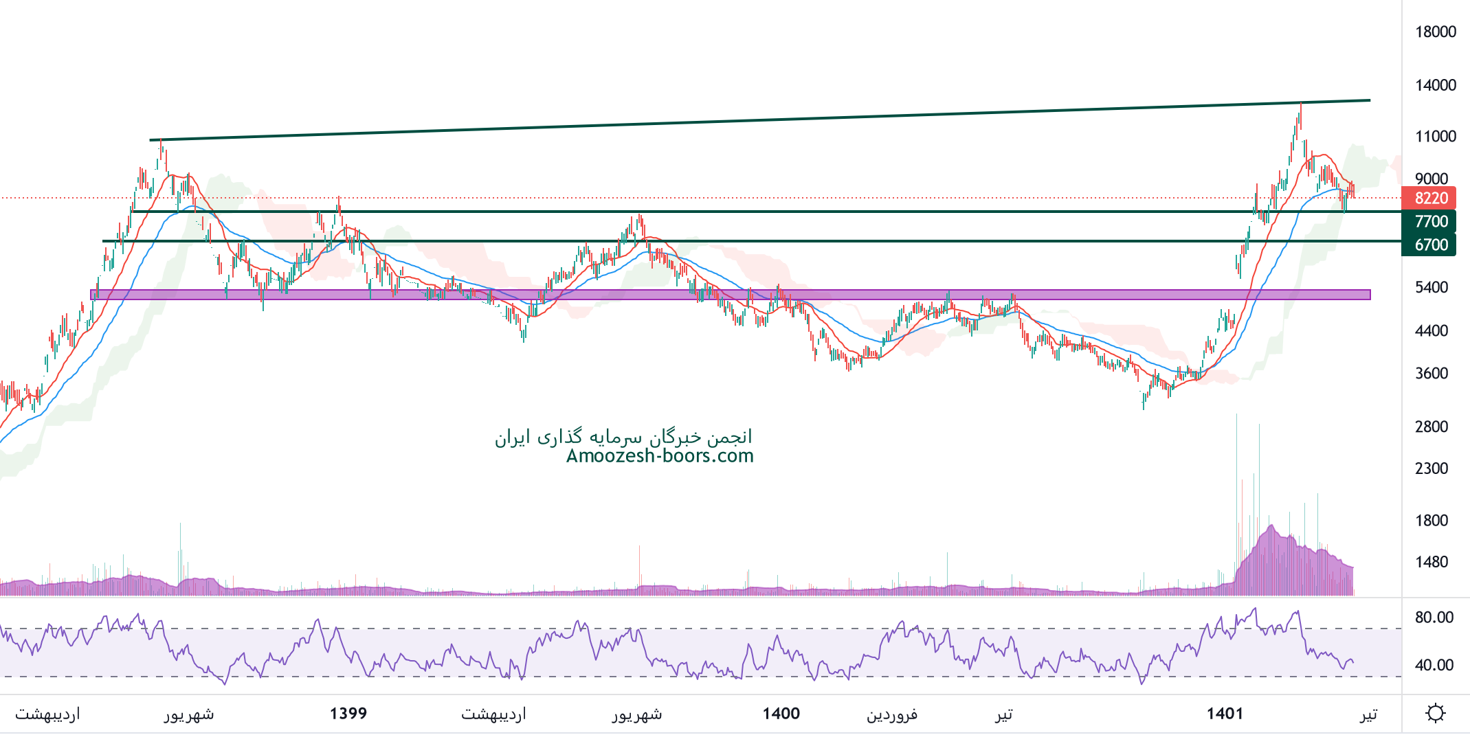 در بررسی نمودار تکنیکال نماد فسپا قیمت سهم در یطح حمایتی 7700 ریال قرار دارد، در صورتی که سهم فسپا موفق به تثبیت در این منطقه شود، میتوان تارگت محدوده 13000 ریال را برای فسپا متصور بود، همچنین در صورت ادامه دار شدن اصلاح قیمتی و پر فشار شدن عرضه و از دست رفتن سطح حمایت مذکور، حمایت بعدی 6700 ریال خواهد بود.
