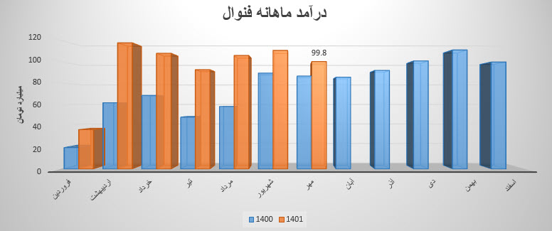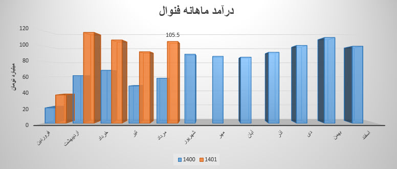 (96%) درصد از درآمد فنوال در مرداد ماه 1401 مربوط به فروش داخلی و (4%) درصد آن مربوط به کل صادرات شرکت است.فنوال درین ماه ، مبلغ 105.5 میلیارد تومان درآمد داشته است که نسبت به ماه قبل 14% افزایش و نسبت به میانگین ماه های قبل 19% افزایش داشته است. شرکت نسبت به دوره 1 ماهه مشابه سال قبل 82% افزایش درآمد داشته است.