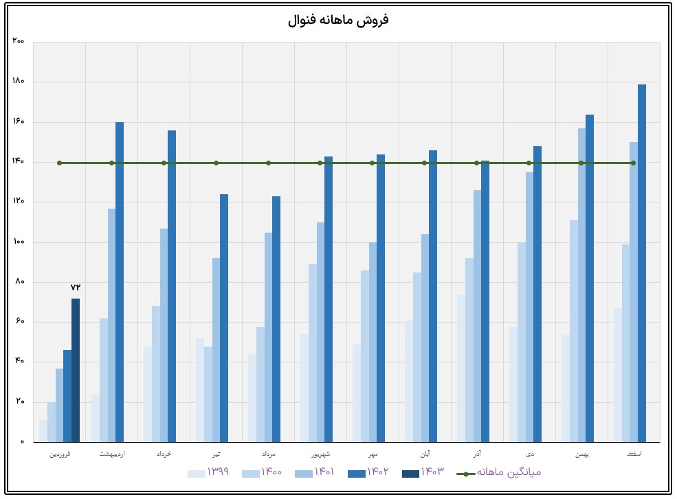 نماد فنوال در فروردین ماه حدود بیش از 607/000 کیلوگرم از محصولات خود را به فروش رسانده که این میزان در مقایسه با حجم فروش ماه گذشته خود 57% کاهش داشته است.