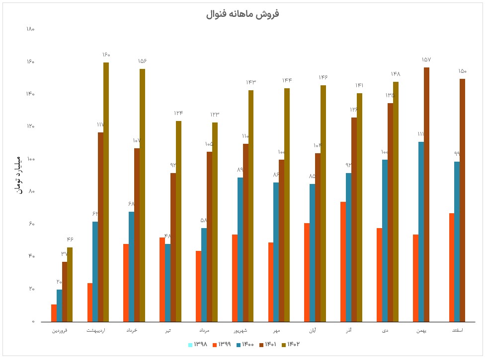فروش آذر ماه سال 1402 سهم فنوال 141.1 میلیارد تومان گزارش شده است، تغییرات درآمدی فنوال به شرح زیر میباشد: