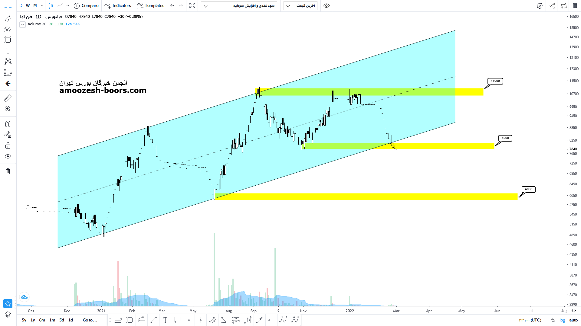 قیمت سهم فن اوا بعد از واکنش به مقاومت استاتیک خود در حال حرکت به سمت کف کانال صعودی خود میباشد و در صورت از دست رفتن این حمایت نزول سهم تا 7800 ریال دور از ذهن نیست و در صورت رد شدن از مقاومت استایتک خود تارگت سهم سقف کانال صعودی در نظر گرفته خواهد شد.
