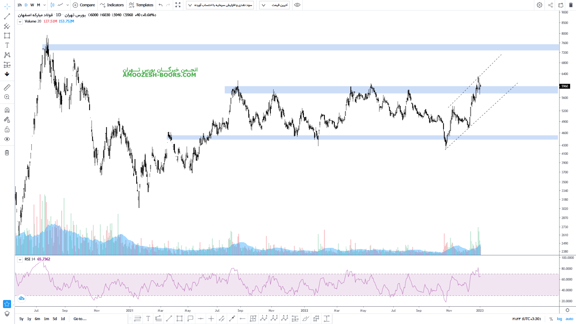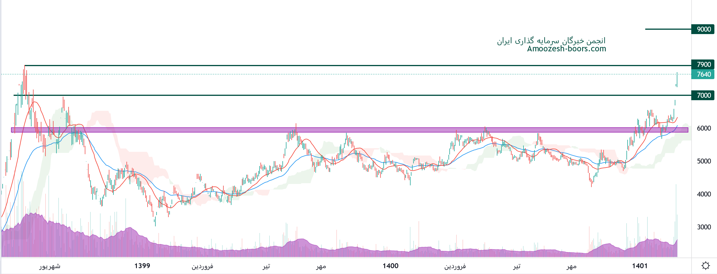 نماد فولاد بعد از حدود 80 درصد رشد به محدوده مقاومتی پر ریسک سقف تا ریخی خود در محدوده قیمتی 7900 ریال نزدیک شده است، در صورت حفظ قدرت حرکت صعودی خود و ادامه دار شدن فشار تقاضا و عبور از این مقاومت مهم، حرکت سهم تا محدوده 9000 ریال محتمل خواهد بود، همچنین در صورت اصلاح سهم فولاد، اولین حمایت 7000 ریال ارزیابی خواهد شد.