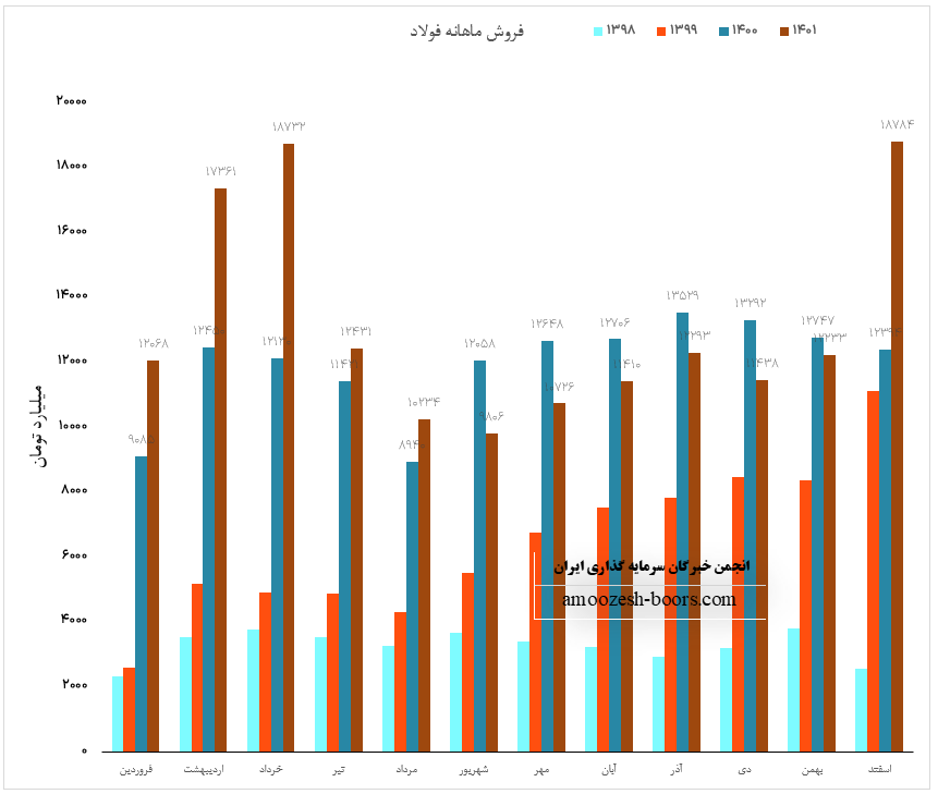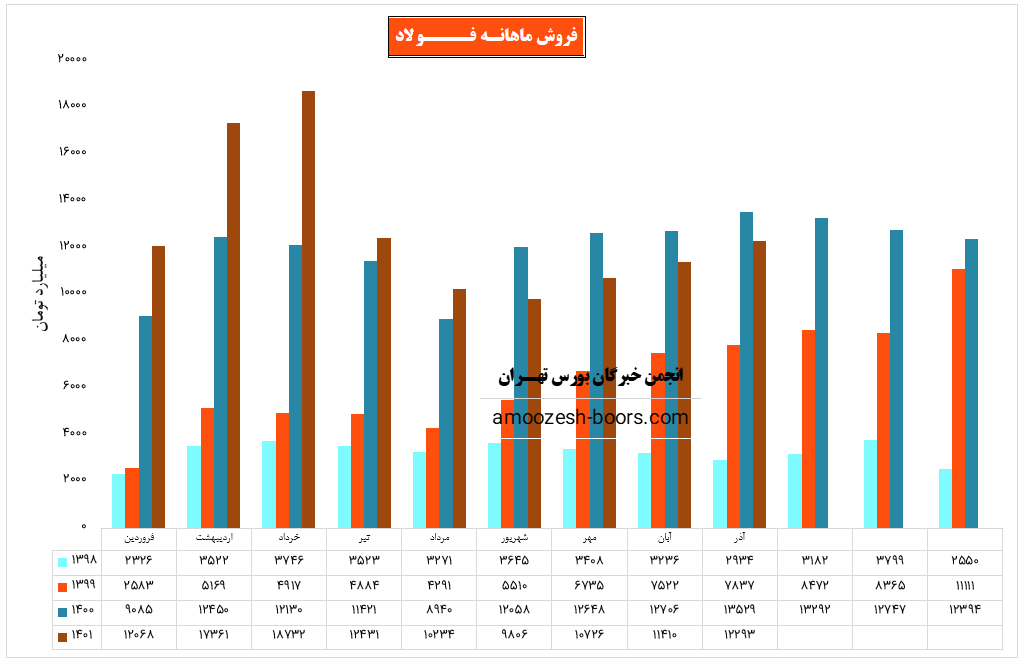نماد فولاد با افزایش 7 درصدی نسبت به ماه گذشته به رقم 12233.4 میلیارد تومانی رسید، این رقم در مقایسه با متوسط ماهانه و مدت مشابه به ترتیب افت 3 و 4 درصدی را تجربه نموده است، بیشترین وزن سبد فروش سهم فولاد محصولات گرم و سرد هستند، مقدار فروش محصولات گرم نسبت به ماه قبل کاهش 8 درصدی و نرخ فروش افزایش 10 درصدی داشته است، همچنین نرخ فروش محصولات سرد نیز رشد 8 درصدی را تجربه نموده است، با توجه به بهبود نسبی نرخ فروش و ثبات در مقدار فروش، همچنین شناسایی سود سرمایه گذاری ها در 3 ماهه آخر سال مالی انتظار میرود نماد فولاد در مقایسه با دوره گذشته با بهبود سود مواجه باشد، مجموع درآمد 11 ماهه شرکت فولاد مبارکه نسبت به مدت مشابه رشد 6 درصدی داشته است.