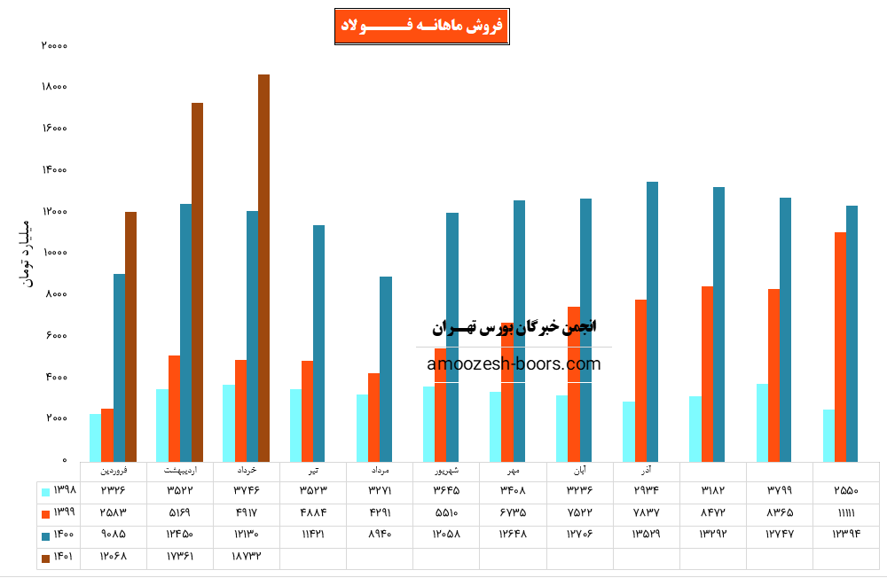فولاد در اردیبهشت فروش فوقالعاده 173.612 میلیارد ریالی را ثبت کرده است که رشد 44 درصدی نسبت به ماه فروردین نشان می دهد. این مقدارفروش در فروردین سال جاری و مدت مشابه سال گذشته 120.678 و 124.500 میلیارد ریال گزارش شده بود. (93%) درصد از درآمد شرکت درین ماه مربوط به فروش داخلی و (7%) درصد آن مربوط به کل صادرات شرکت است.