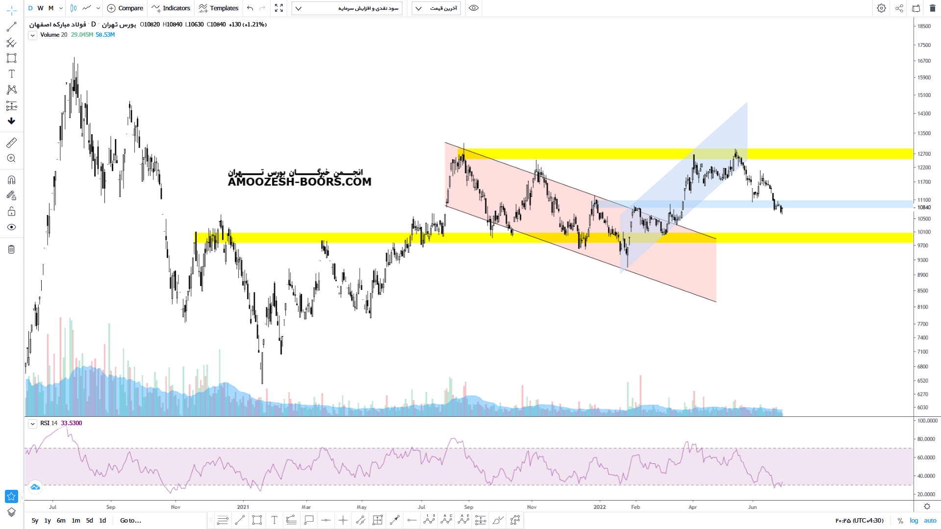قیمت سهم فولاد پس از از دست دادن کف حمایتی کانال صعودی خود با شتاب بیشتری به اصلاح خود پرداخته و اکنون به ناحیه حمایتی محدوده 1100 تومان رسیده که در صورت از دست دادن این حمایت اصلاح خود را میتواند تا محدوده حمایتی ۹۵۰ تومان نیز ادامه دهد ما در صورت برگشت از این محدوده حمایتی می تواند تا محدوده مقاومتی ۱۲۵۰ تومان نیز رشد کند.
