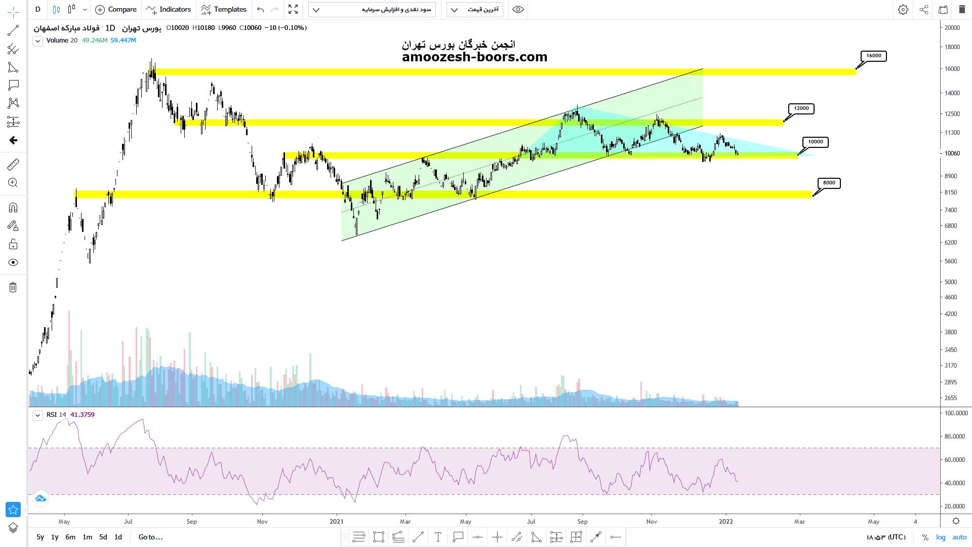 با توجه به اصلاح قیمتی در قالب الگوی مثلث و همچنین قرار گیری قیمت بر روی محدوده حمایتی 1000 تومان که در صورت حمایت و رشد میتواند سقف مثلث را شکسته و تا محدوده 1200 در هدف اول صعود کند و درصورت شکست محدوده مقاومتی 1200 این صعود تا 1600 تومان نیز میتواند ادامه داشته باشد