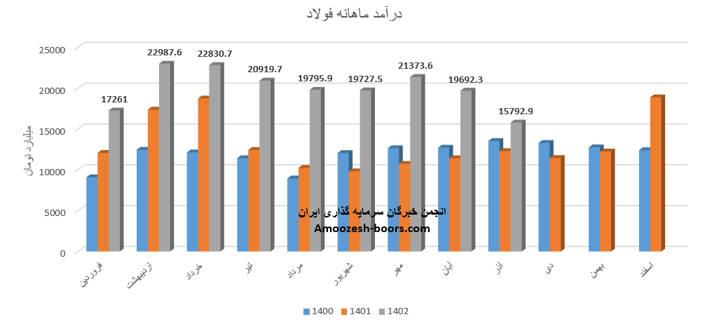 فروش آذر ماه سال 1402 سهم فولاد 15792.9 میلیارد تومان گزارش شده است که 96% از این رقم از طریق فروش داخلی و مابقی از طریق صادرات تامین گردیده است، تغییرات درآمدی فولاد به شرح زیر میباشد: