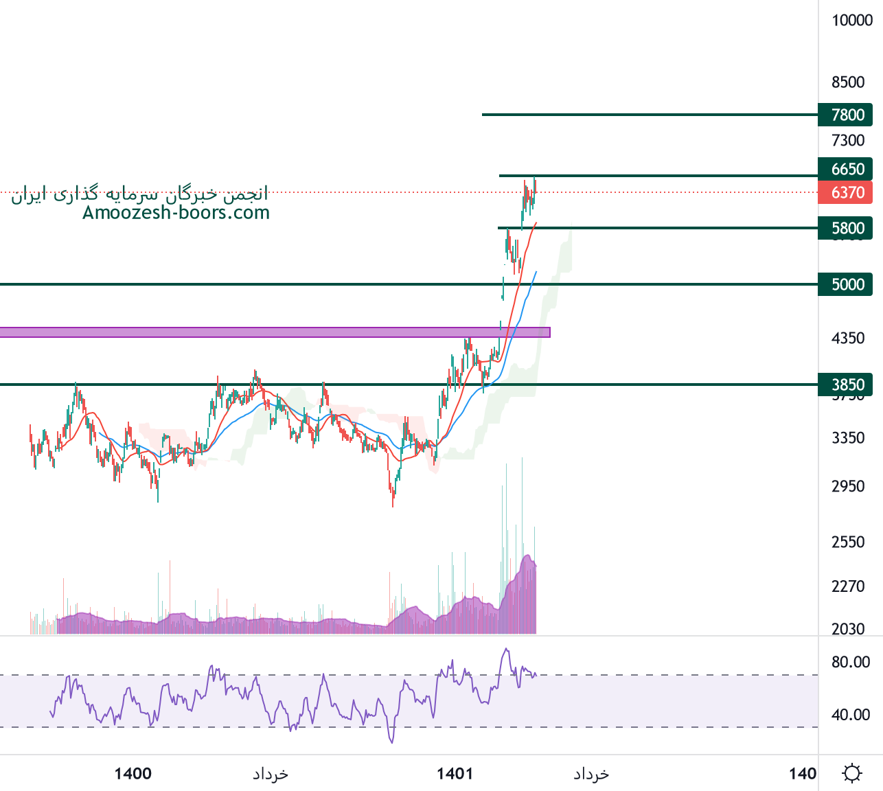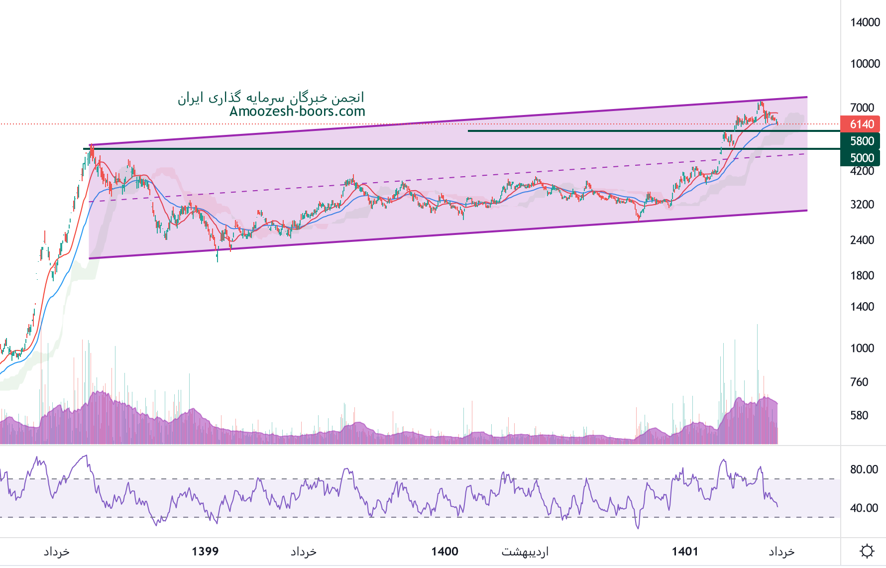 نماد فولاد به سقف کانال صعودی خود واکنش نشان داده، اگر سهامدار این نماد هستید مادامی که قیمت بالای سطح حمایتی 5800 ریال باشد خطر خاصی سهم را تهدید نخواهد کرد و تارگت فولاد محدوده 7500 ریال خواهد بود، همچنین در صورت از دست رفتن سطح حمایتی مذکورحمایت فولاد 5000 ریال خواهد بود.