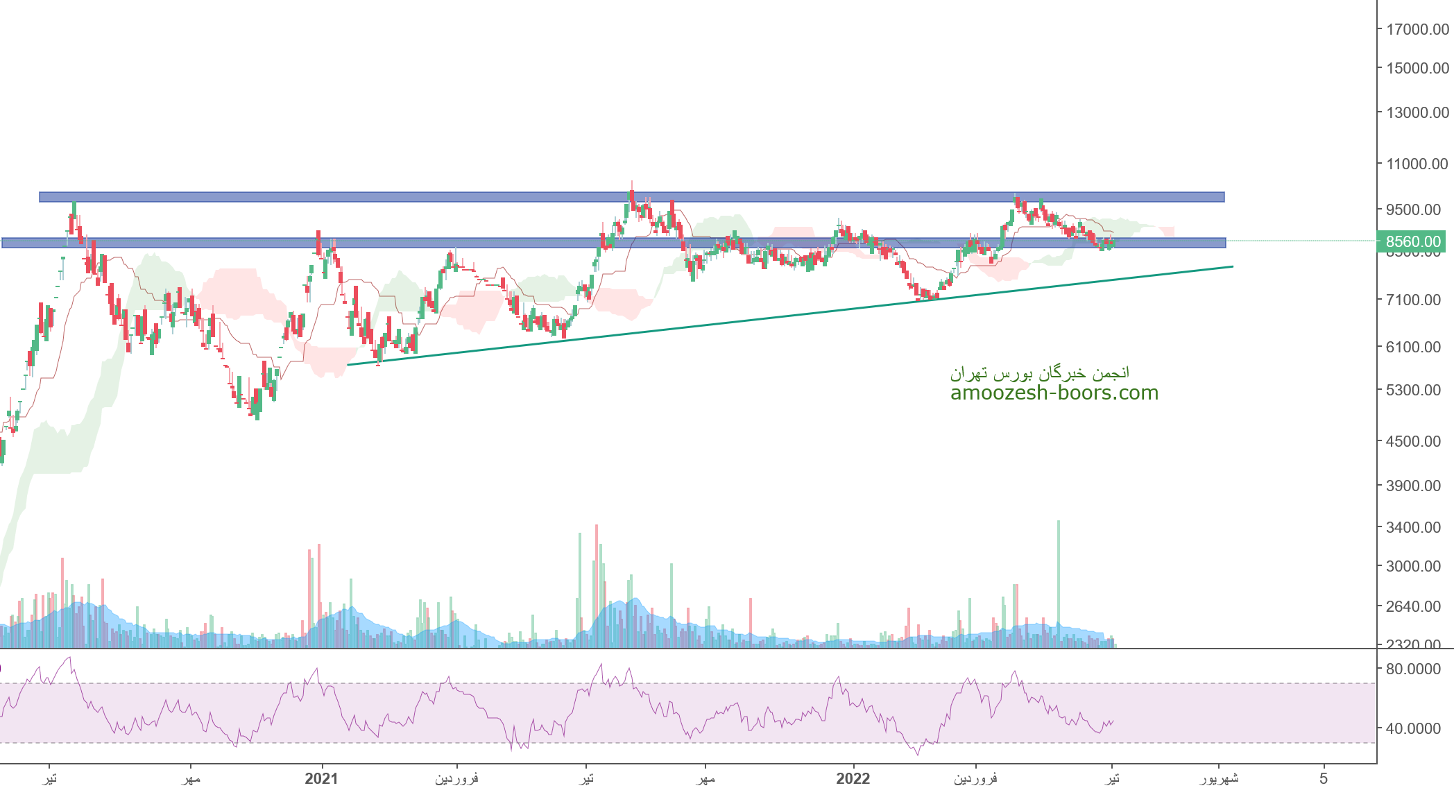 فولاژ حمایت 8400 ریال را دارا میباشد،در صورت تثبیت قیمت حرکت سهم تا 10000 ریال محتمل خواهد بود،همچنین در صورت از دست رفتن این حمایت،حمایت بعدی 7700 ریال در نظر گرفته خواهد شد.