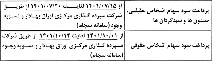 جدول زمانبندی پرداخت سود سهام سهامداران محترم شرکت بابت عملکرد سال مالی منتهی به ۱۴۰۰/۱۲/۲۹ به شرح زیر اعلام می گردد: