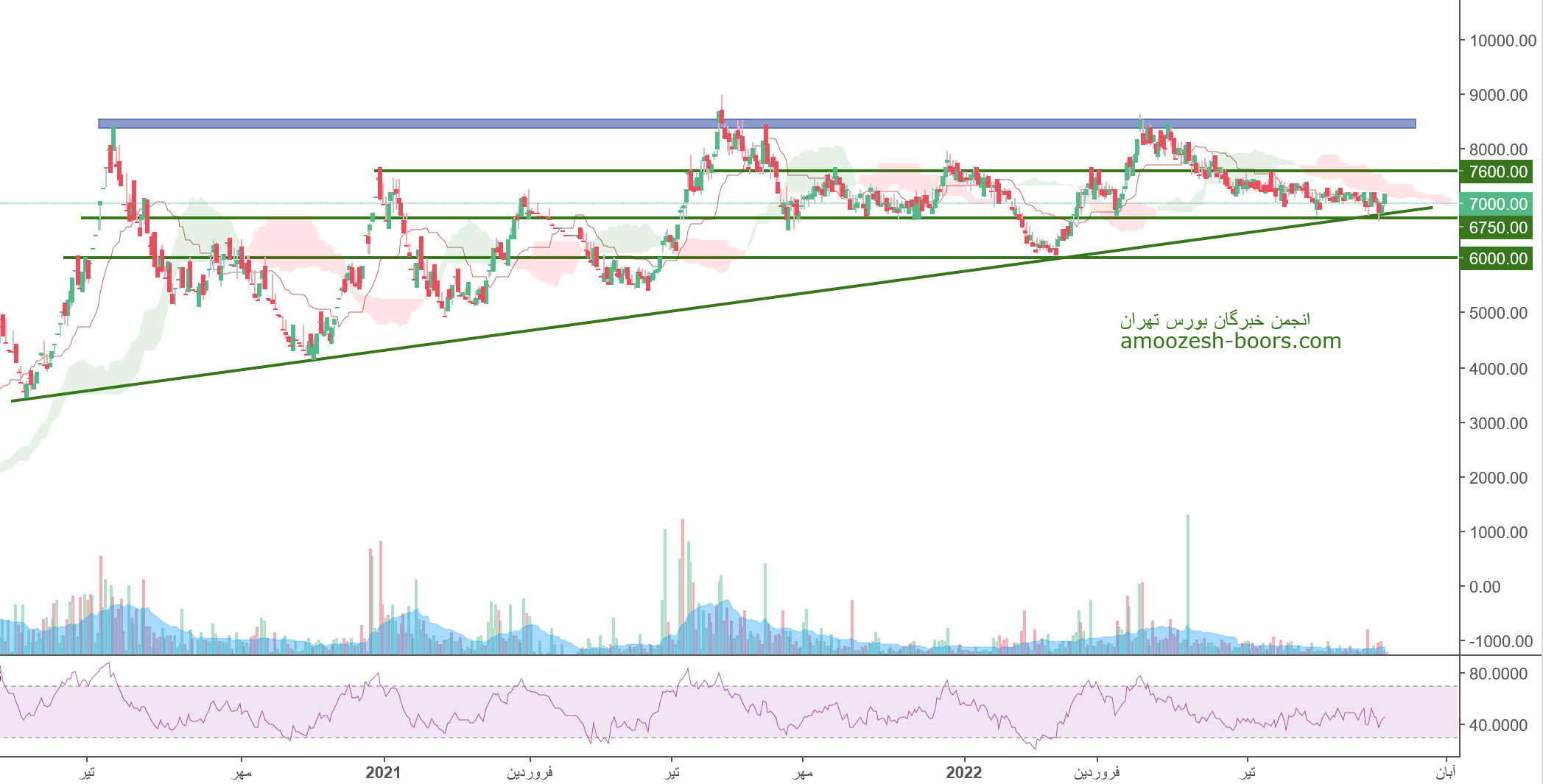 فولاژ در حال حاضر حمایت 6750 ریال را دارا میباشد، در صورت تثبیت قیمت، حرکت سهم تا 7600 ریال دور از ذهن نخواهد بود، همچنین در صورت از دست رفتن این حمایت، حمایت بعدی 6000 ریال در نظر گرفته خواهد شد که در این صورت حد ضرر فعال میگردد.
