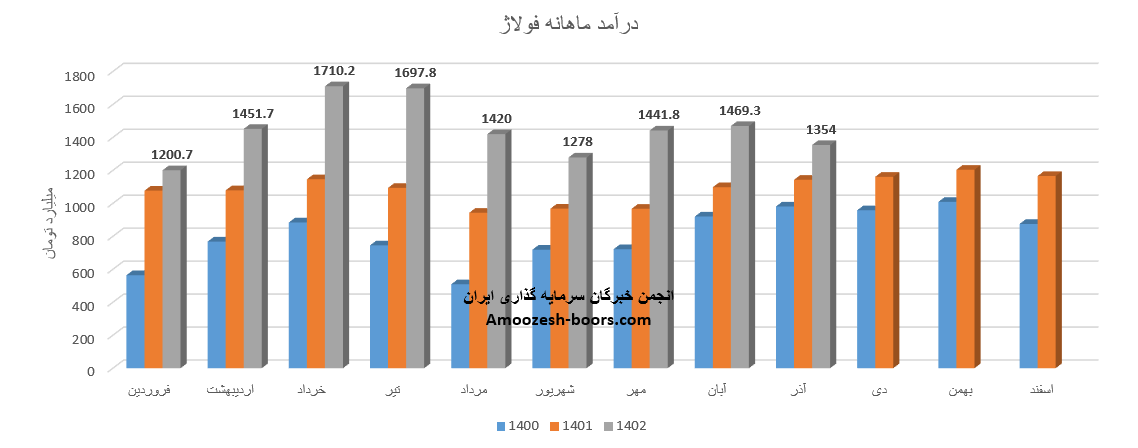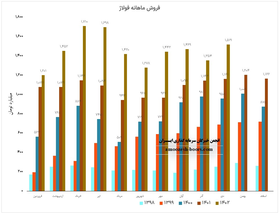 فروش آذر ماه سال 1402 سهم فولاژ 1354 میلیارد تومان گزارش شده است که 83% از این رقم از طریق فروش داخلی و مابقی از طریق صادرات تامین گردیده است، تغییرات درآمدی فولاژ به شرح زیر میباشد: