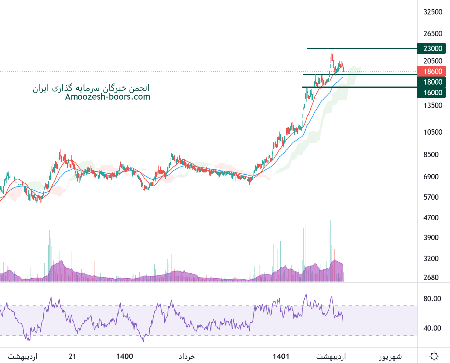 نماد فولاژ که وارد فاز اصلاحی شده، به سطح حمایتی 16000 ریال نزدیک شده است، در صورت ادامه دار شدن اصلاح و از دست رفتن سطح حمایتی مذکور، حمایت بعدی 14000 ریال ارزیابی خواهد شد، همچنین در صورت تثبیت قیمت، تارگت فولاژ 22000 ریال خواهد بود.