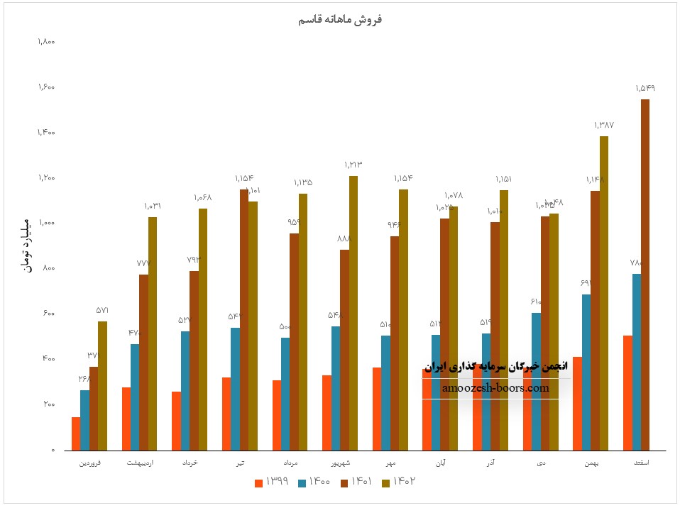 فروش قاسم در این ماه افزایش 45% در مقایسه با ماه گذشته داشته است. همچنین در مقایسه به مدت مشابه 30% و نسبت به متوسط ماهانه 85% افزایش داشته است.