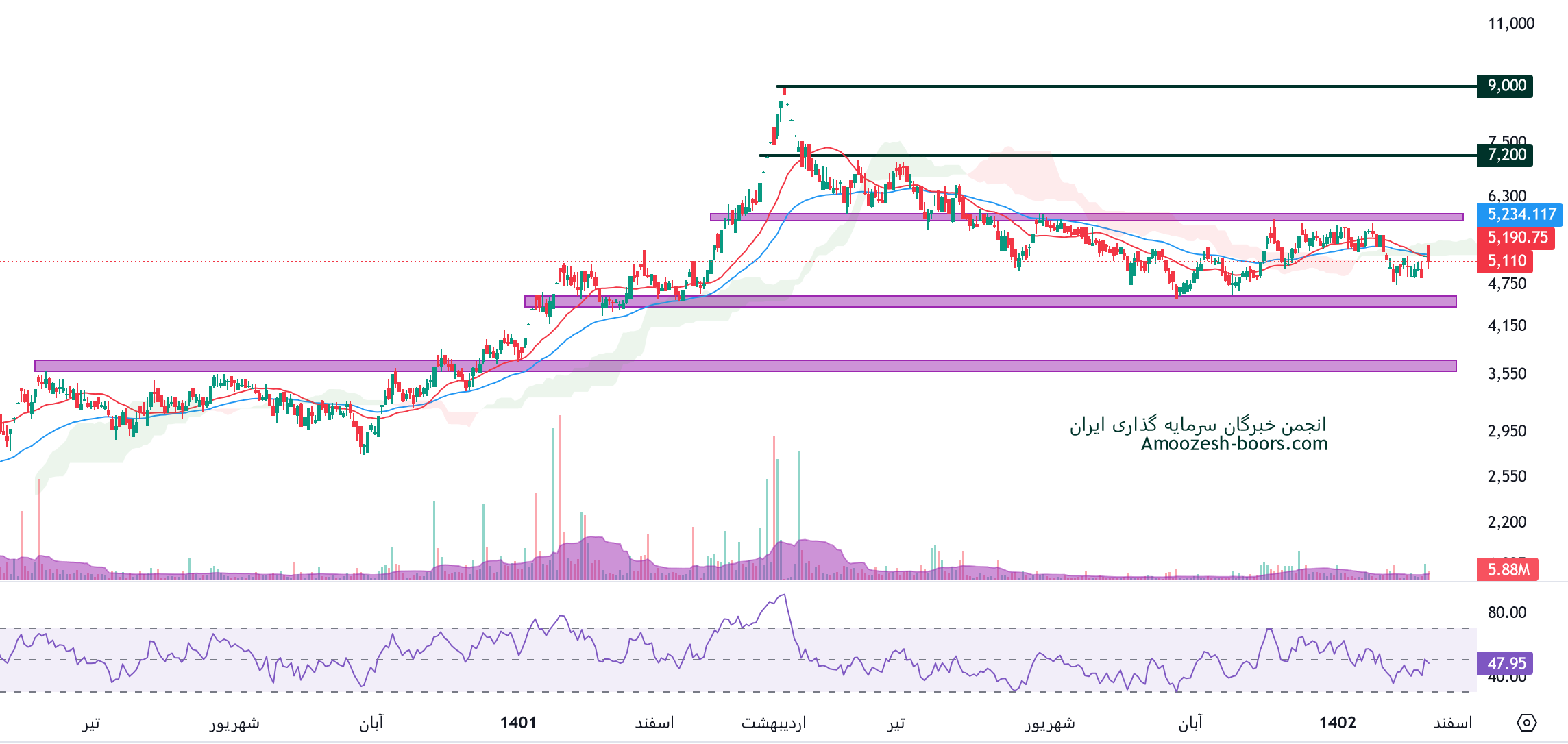 با توجه به سقف و کف ساخته شده در نمودار قاسم انتظار نوسانات کوتاه مدت در این سطح میرود، و با توجه به جو بازار انتظار حرکات شارپی و بلند نمیرود.